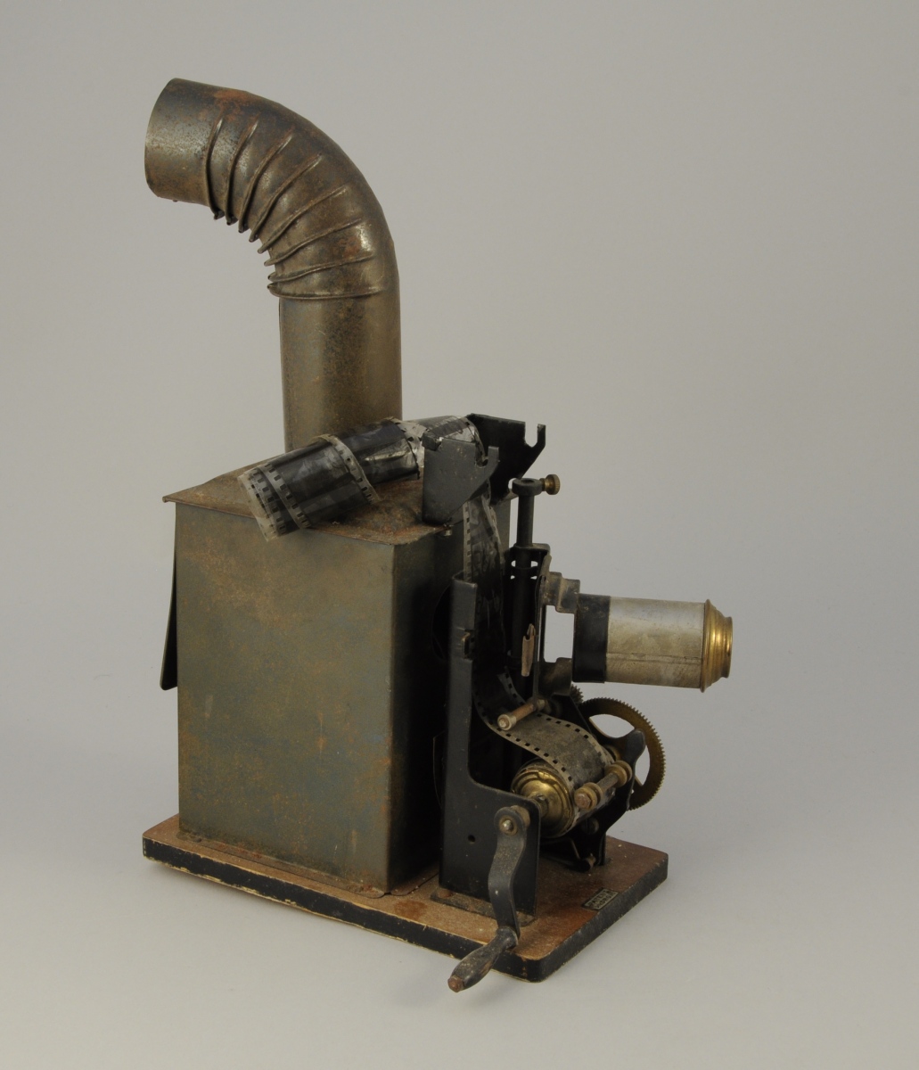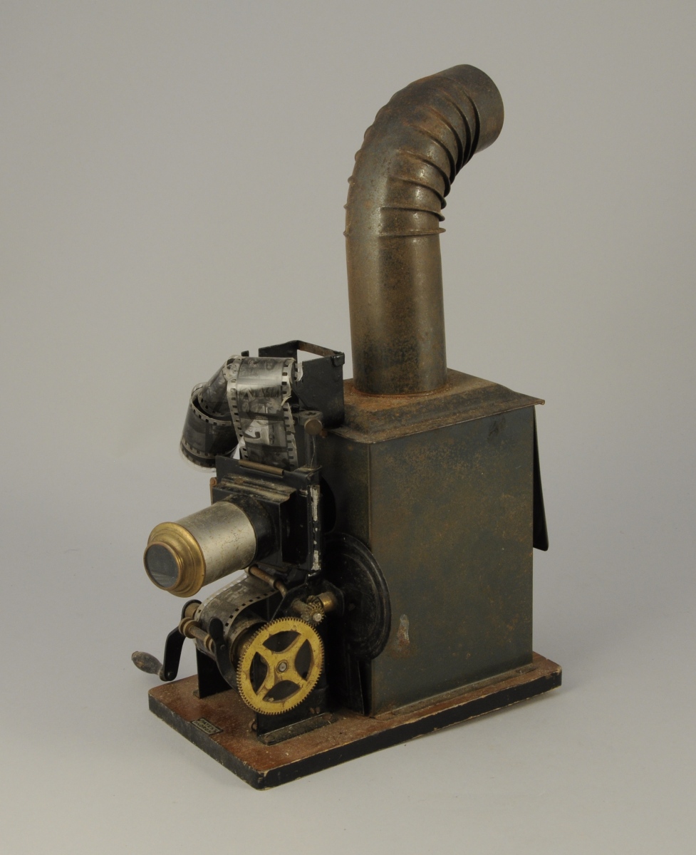 LANTERNE de PROJECTION "BAVARIA" à manivelle en tôle. Porte-plaque en laiton. Avec sa lampe électrique. Marque "BAVARIA" à la tête de lion. Avec un film (accidenté)