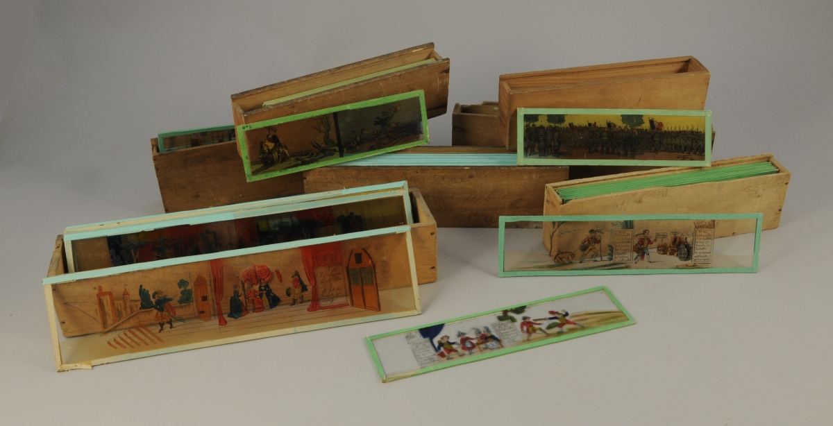 LOT de 83 PLAQUES COLORIÉES rectangulaires pour lanterne de projection. Contes (Cendrillon, Le Petit Chaperon Rouge, Cadet Roussel, Riquet à la Houppe et autres), scènes du Nouveau Testament, Fables de La Fontaine et divers. Dans un coffre en bois. Fin XIXème - début XXème.