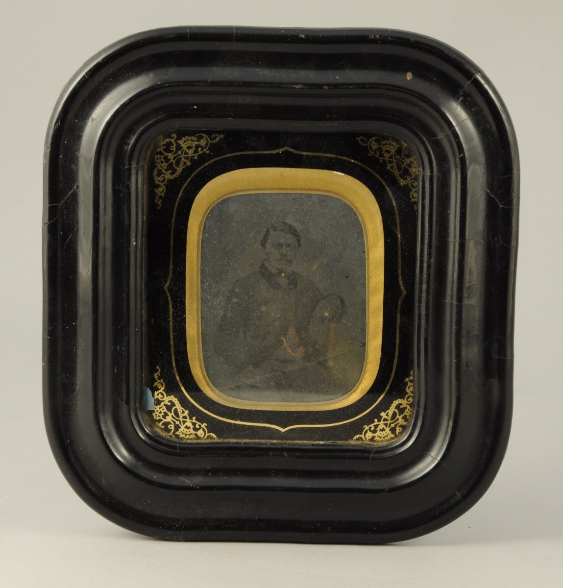 Daguerréotype rectangulaire à bords arrondis, dans un cadre en bois noirci.
