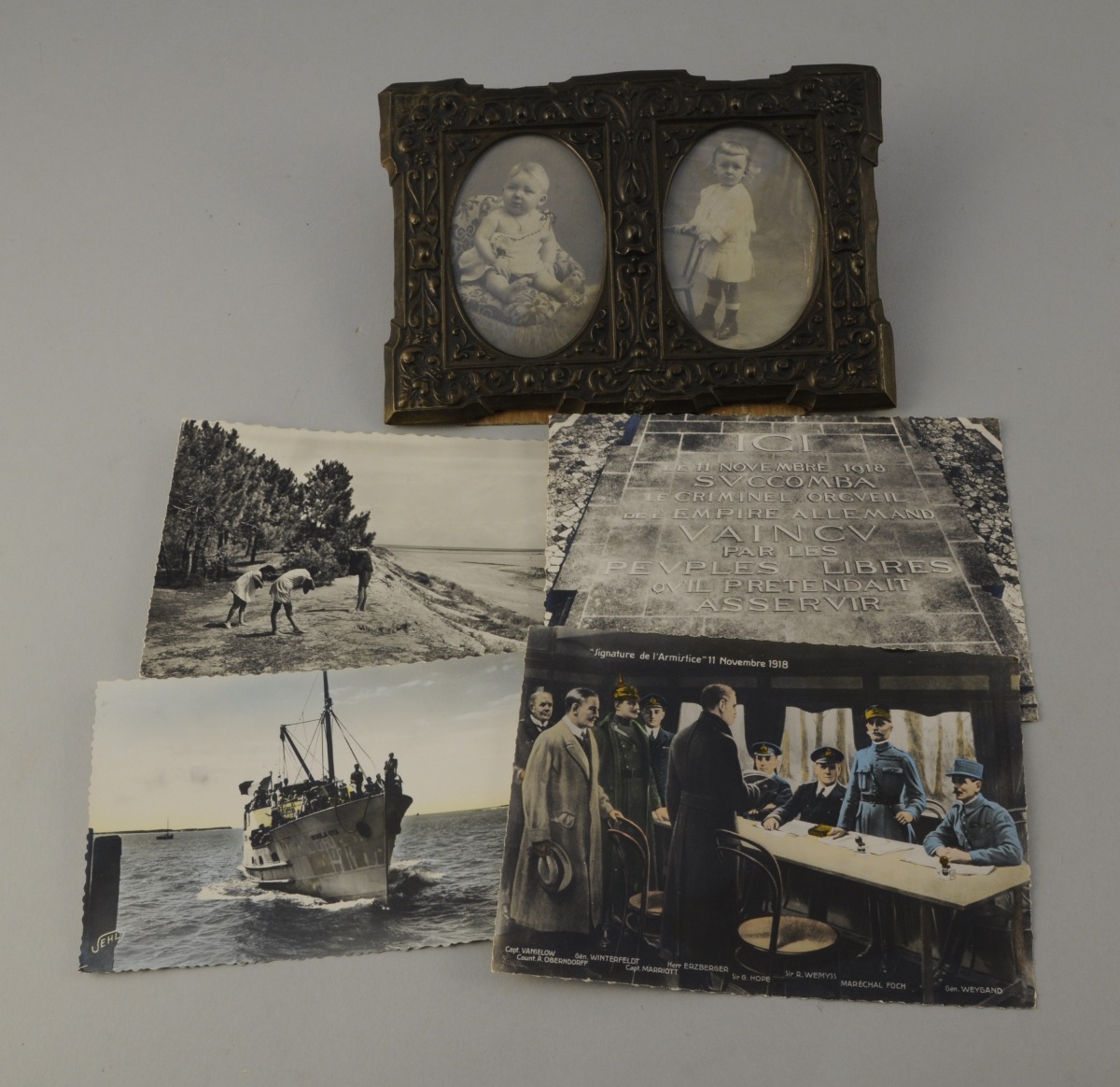 CADRE PORTE-PHOTOS double à vues ovales, l'encadrement en laiton repoussé de rinceaux alternés de petits cartouches.