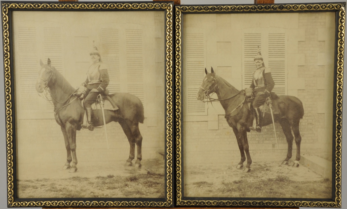 CUIRASSIERS. Deux tirages photographiques anciens. Fin XIXème. Dans deux cadres en bois noirci et doré.