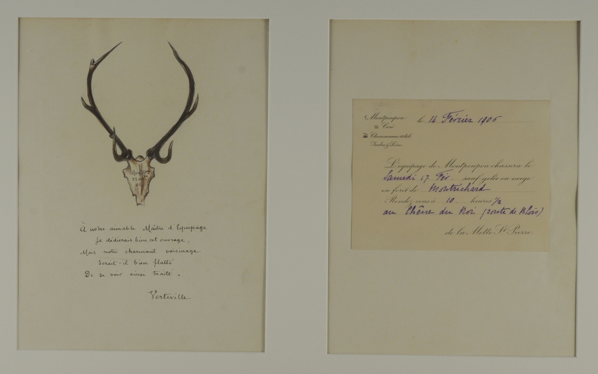 - "Les Forêts et Rendez-vous de l'équipage de Montpoupon". Avec au crayon les noms des maîtres d'équipage. Orné d'un trophée de cerf portant l'inscription "Montrichard 24 Nov 94".