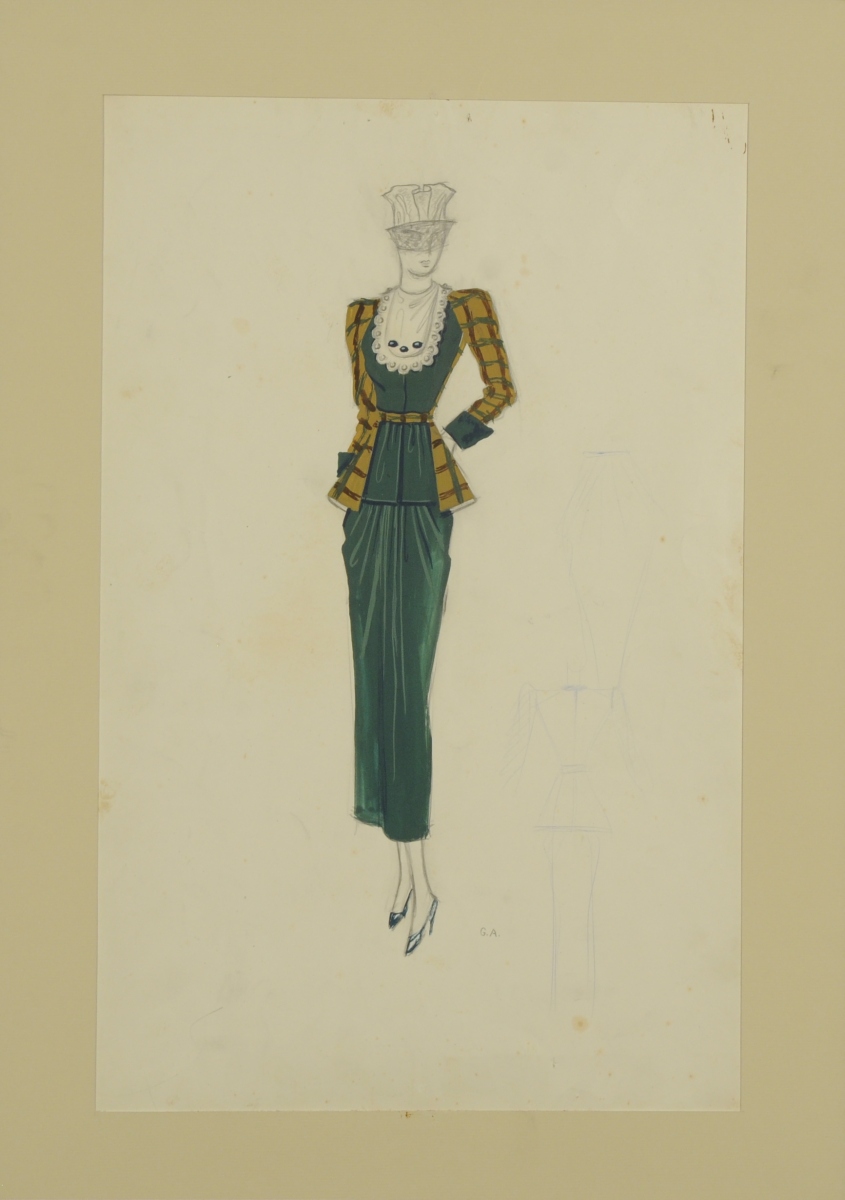 Projet de costume - Ensemble vert pour femme avec veste à carreaux et deux études pour la jupe et la veste.