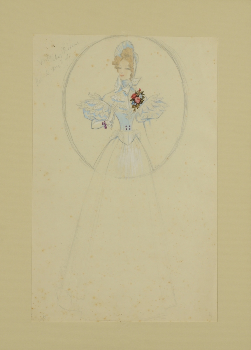 Crayon et aquarelle, monogrammé en bas à droite du médaillon et numéroté 43 bis en bas à gauche et 5 en bas à droite. Porte l'inscription "Visite / chez Rosans / Robe du soir d'été" en haut à gauche.