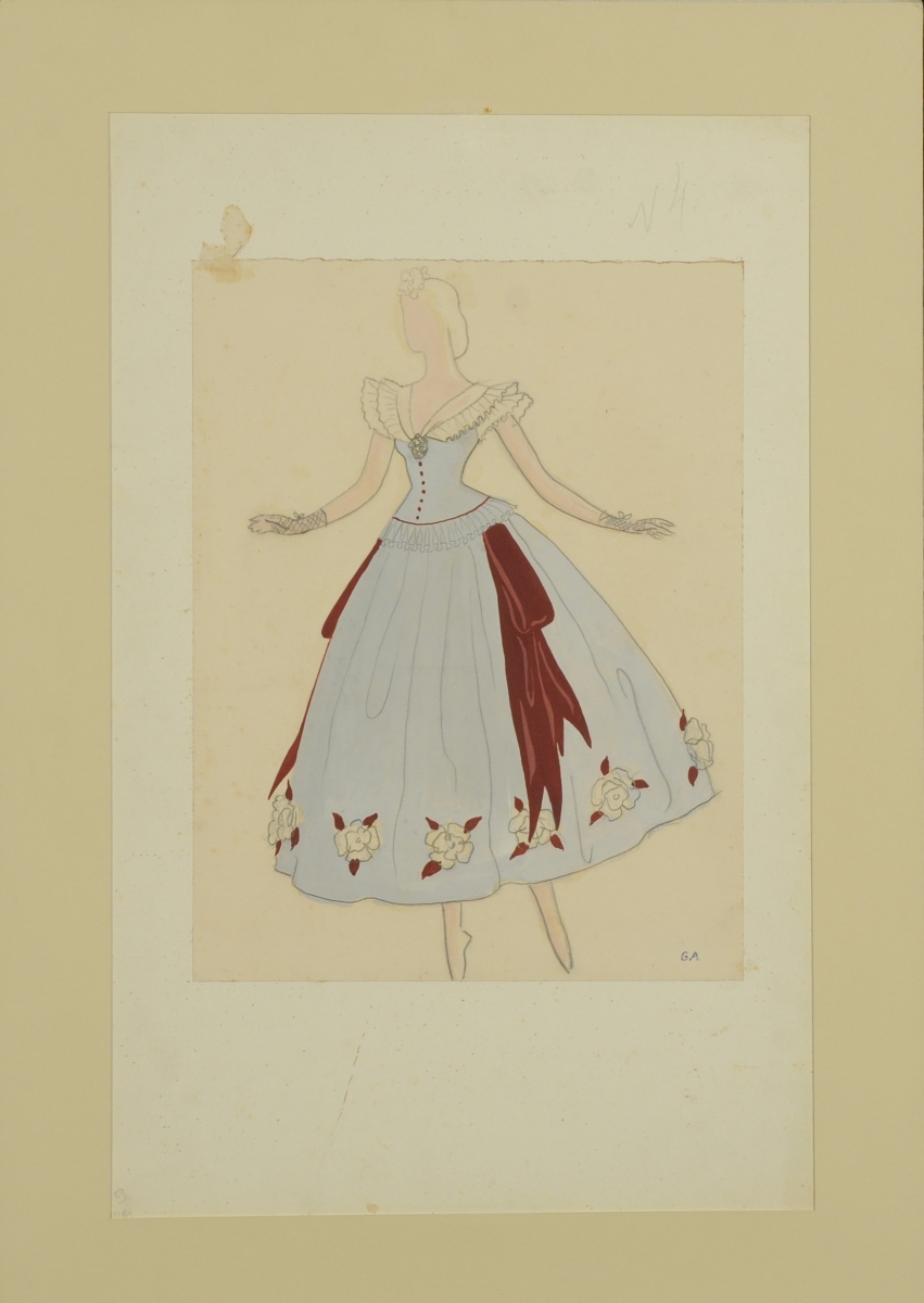 Projet de costume - Robe bleue et bordeaux ornée de roses.