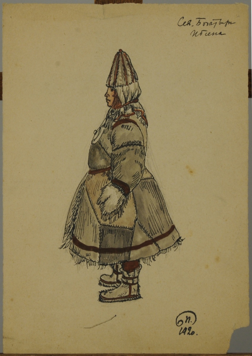 - Maquettes de costumes inuits. Deux feuilles. Encre noire et aquarelle, monogrammés "GN"?, datés "1920" et annotés en cyrillique au recto et au verso au crayon. 25 x 17,5 cm. (tâches, déchirures)