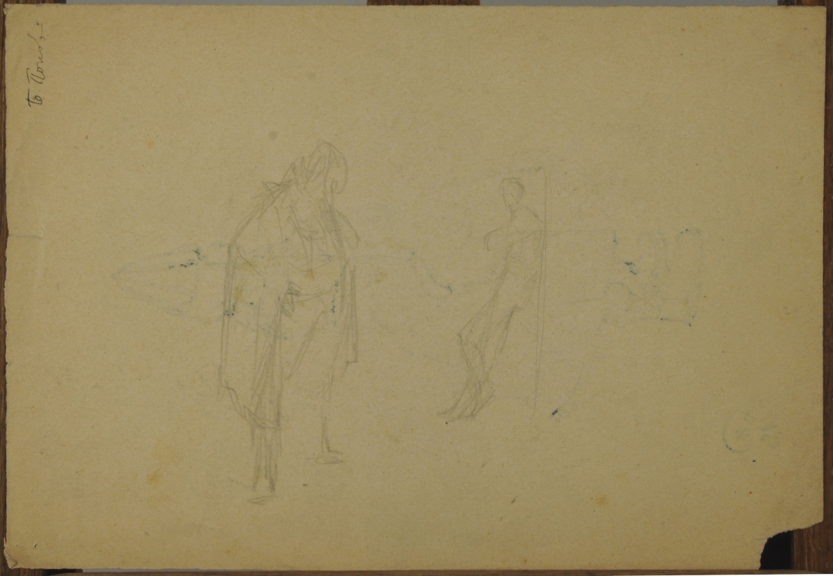 - Maquettes de costumes antiquisants. Deux feuilles. Encre noire et encre noire et aquarelle, annotés en cyrillique au recto et au verso au crayon, l'un daté "1920". 25 x 18 et 258,5 x 15 cm. (tâches, déchirures)