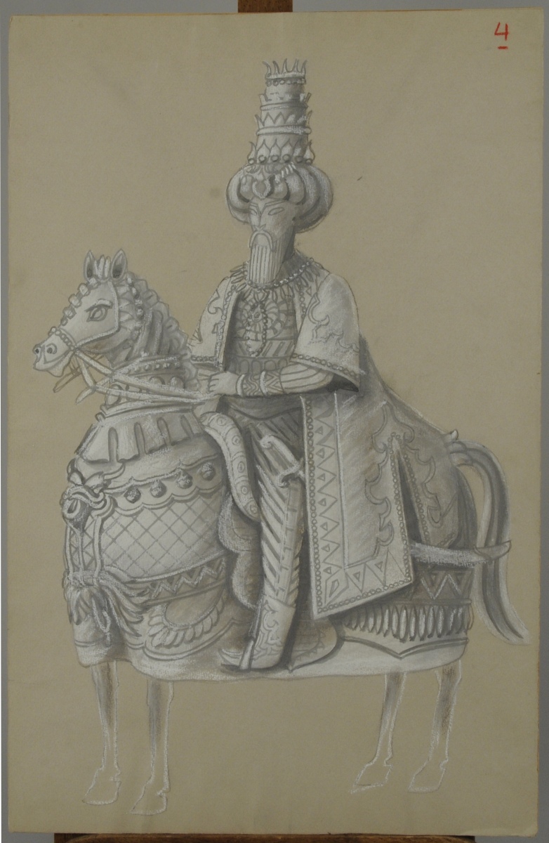 - Maquette de costume. Crayon, aquarelle et rehauts sur papier marouflé sur carton, numéroté en haut à droite "4". 50 x 23,5 cm.