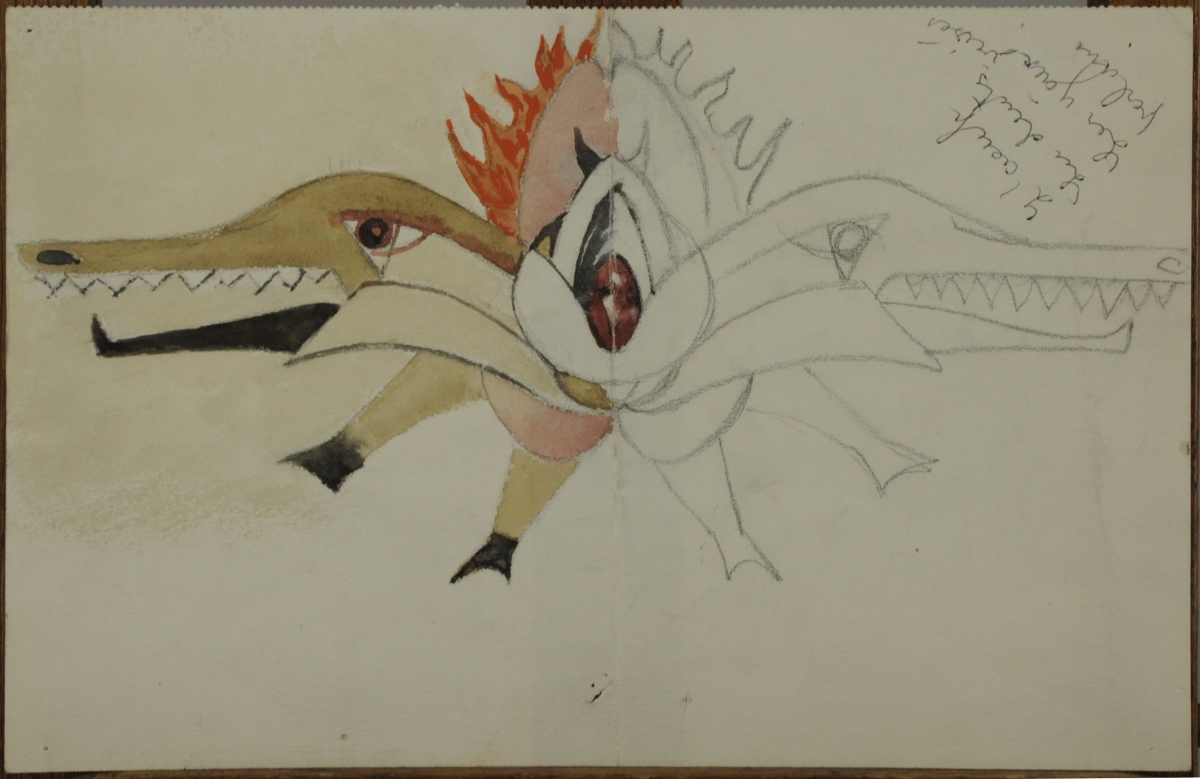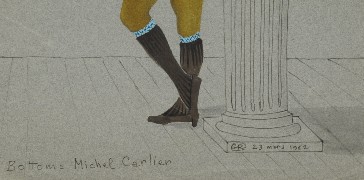 Crayon et gouache, annoté "Le Songe d'une nuit d'été / masque = Petrus bride? / Bottom: Michel Carlier", monogrammé "GR" et daté "23 mars 1962".