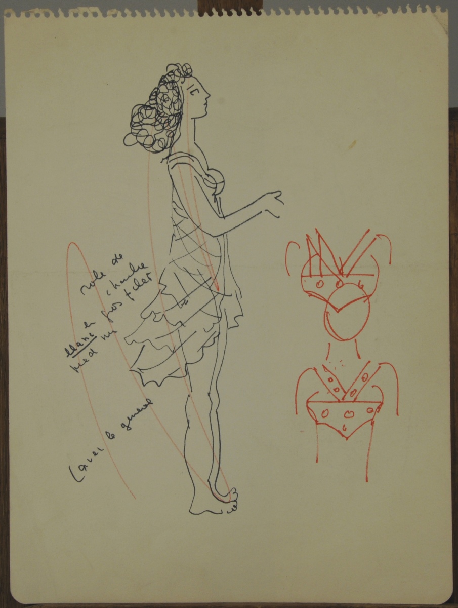 Crayon, aquarelle et gouache sur papier, annoté "Lambroso MAR... / 1953 théâtre de l'oeuvre / Les Sargasses de Mouloudji" et portant des indications de mesures au recto et au verso.