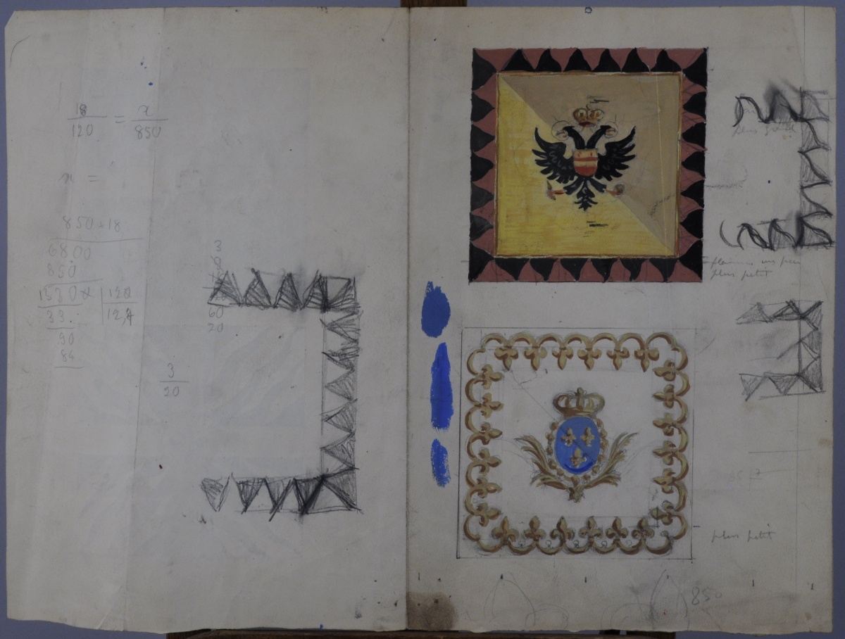 - Maquettes de COSTUMES et d'ÉTENDARRS. Trois feuilles. Encre et gouache. Formats divers. Le plus grand, 32 x 42,5 cm. (usures)