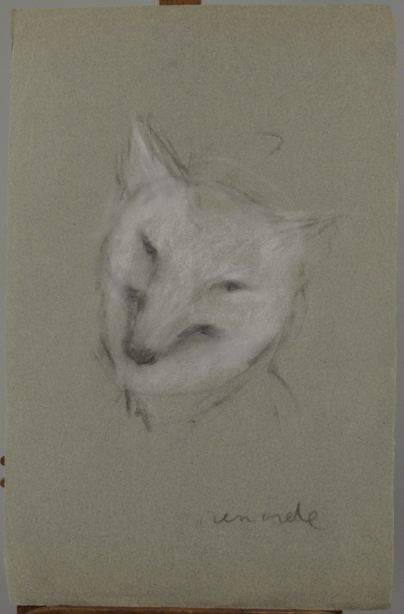 Cinq feuilles. Crayon et rehauts de craie blanche sur papier, deux d'entre elles titrées "renarde".