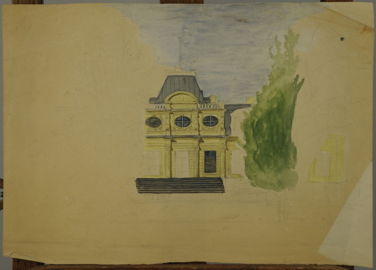 - FAÇADE dans le goût du XVIIIème. Crayon et aquarelle sur papier. 21 x 28 cm. (inachevé, plis)