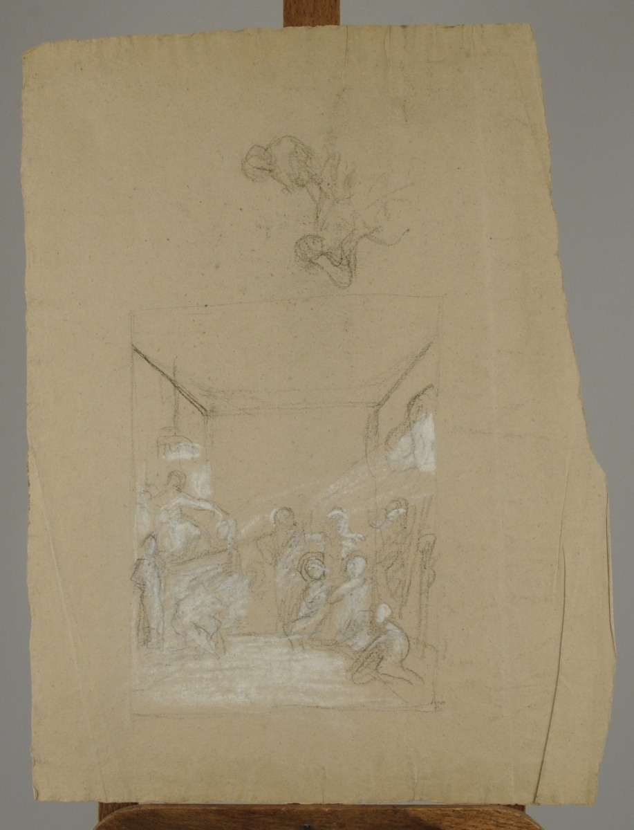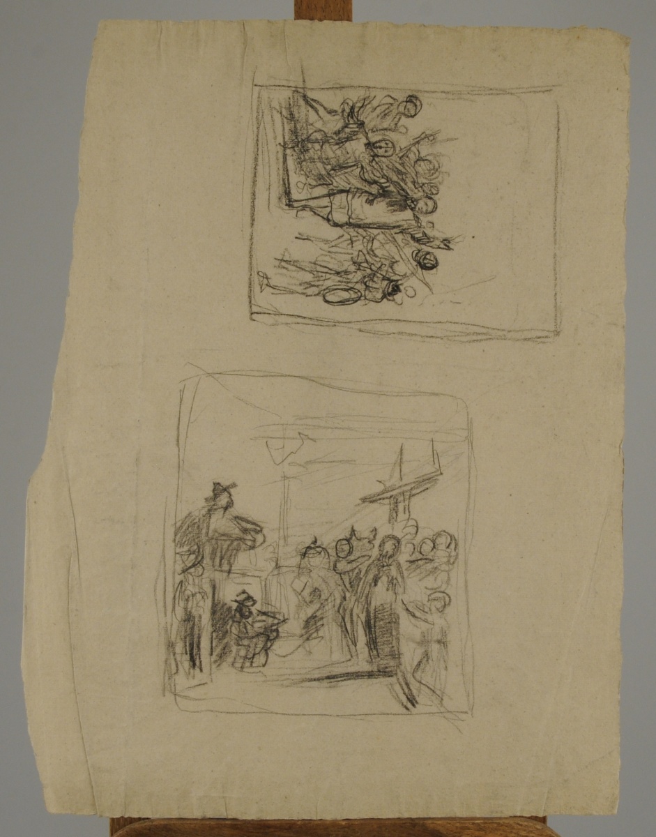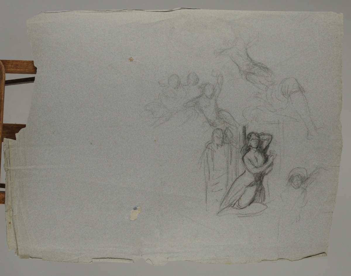 Études. 5 feuilles. Crayon noir sur papier, titrés en bas à droite. L'un rehaussé de craie blanche.