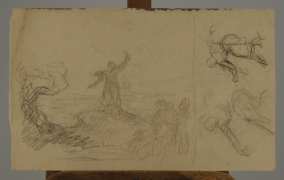 Joint: 3 ÉTUDES. Crayon sur papier, l'un rehaussé de craie blanche. 1 grand format, 40 x 60 cm et 2 moyens formats, environ 40 x 30 cm. (usures, déchirures)