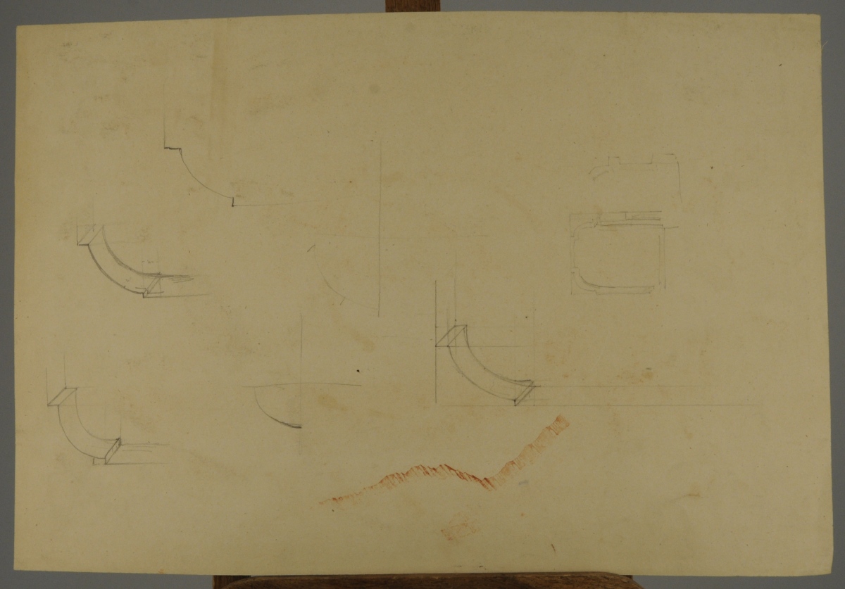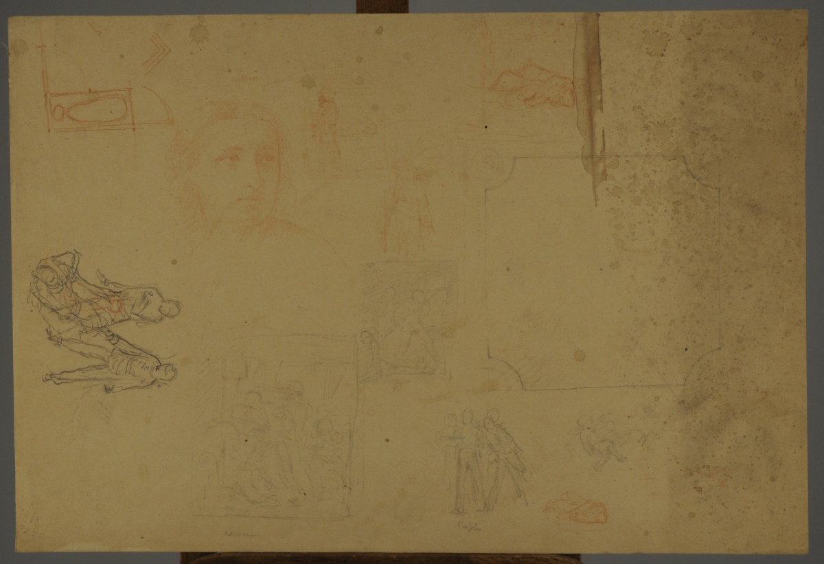 Études de jeune garçon et autres. 6 feuilles. 5 crayon noir et 1 sanguine sur papier, l'un annoté, titré et signé en haut à droite.