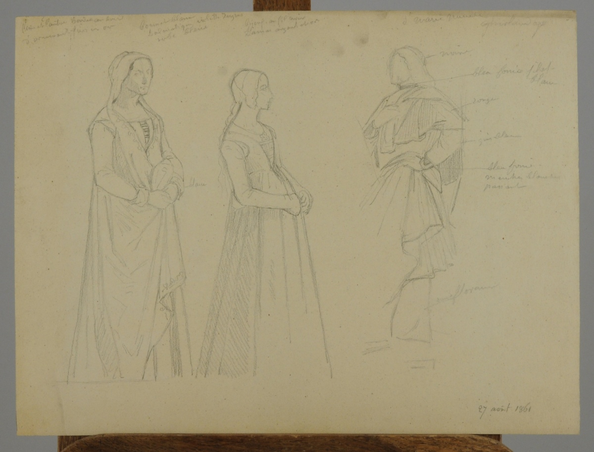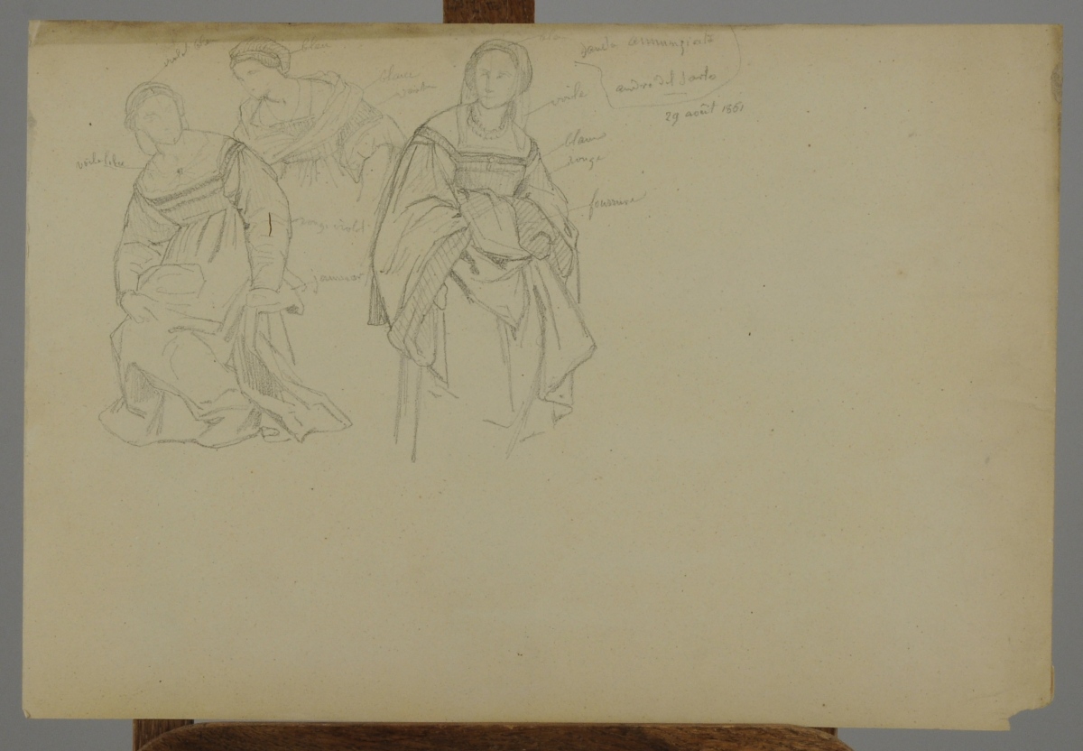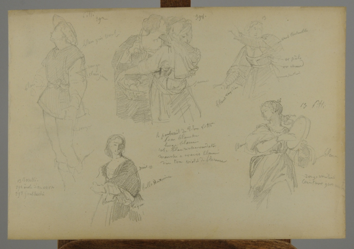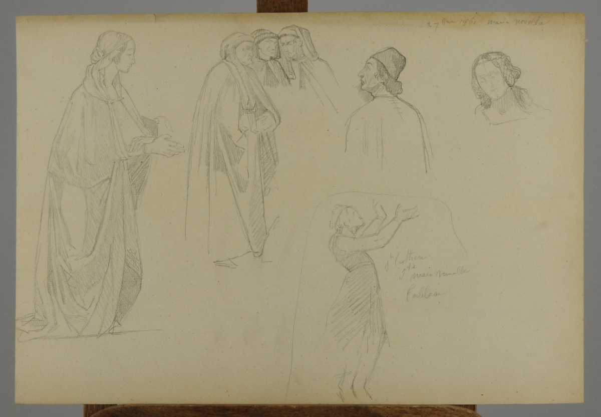 Études de femmes et esquisses dans le goût de la Renaissance italienne, la plupart d'après Andrea del Sarto, d'autres d'après Domenico Ghirlandaio et Gentileschi.