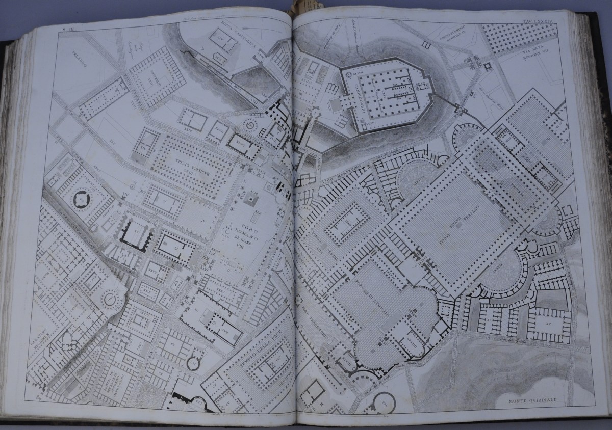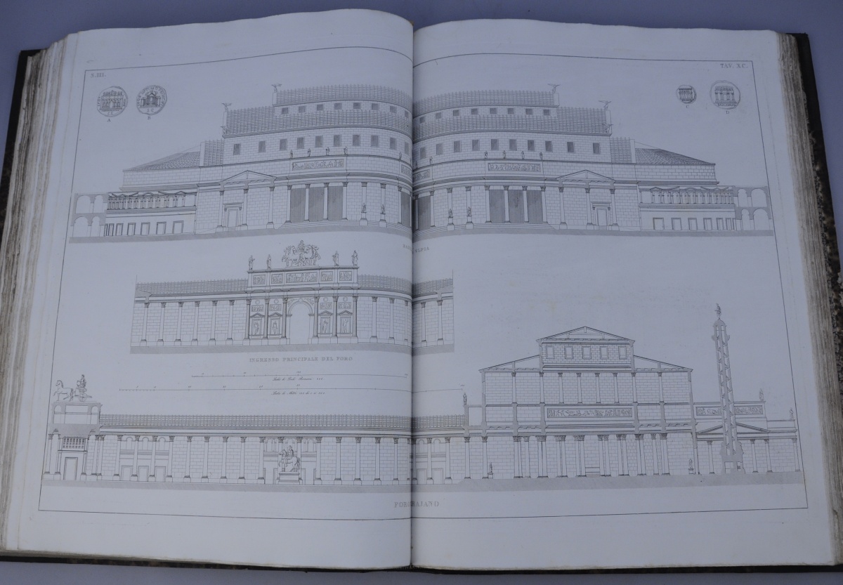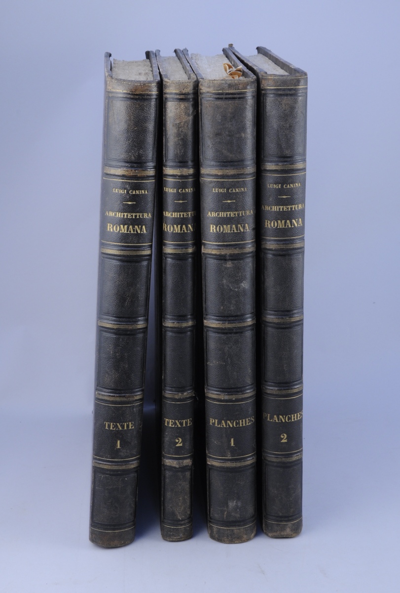 4 forts volumes grand in-folio (510 X 390 mm). Texte: 3 parties en 2 volumes de 172 pages, 271 pages et 236 pages. Atlas: 2 volumes contenant un plan topographique de la Rome Antique en 4 planches doubles (mesurant environ, une fois assemblé, 1350 X 1000 mm, et comptant comme planche I), 255 planches gravées dont un plan de Pompéi sur double page (numéroté II), soit en tout 259 planches numérotées 256, et VIII pages de tables. Solides reliures du milieu du XIXème siècle en 1/2 chagrin à coins. (Quelques minimes épidermures.).