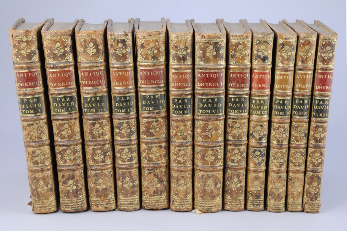12 volumes grand in-4° (265 X 200 mm), plein veau porphyre, triple filet d'encadrement sur les plats, dos à 5 nerfs , orné d'un filet hachuré sur les nerfs et d'un décor floral dans les entre-nerfs. Roulette sur les coupes ; roulette hachurée intérieure. Toutes tranches dorées. (Epidermures parfois fortes provoquées par des poissons d'argent sur presque tous les plats.).
