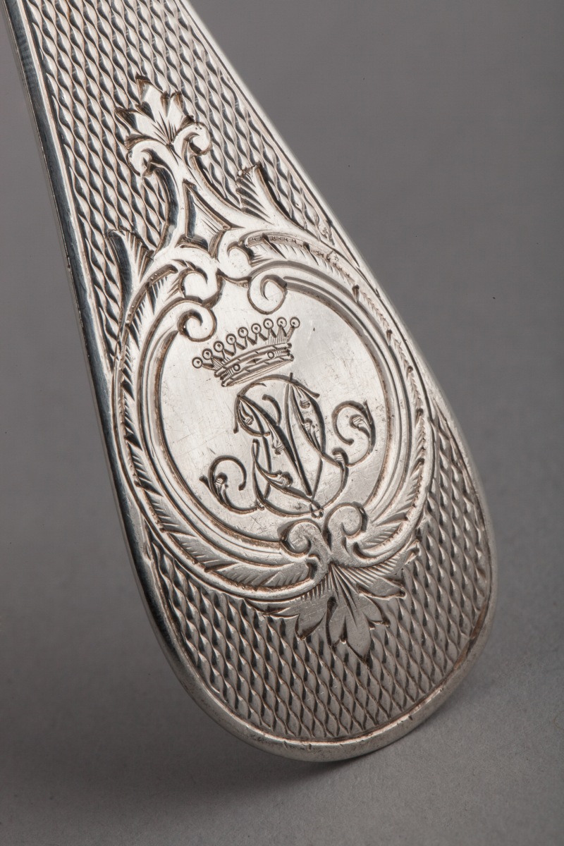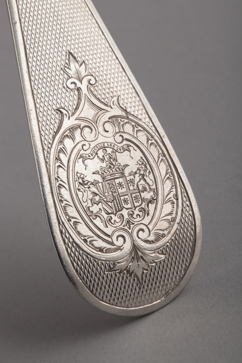armoiries surmontées d'une couronne de marquis - comprenant: 12 couverts de table, 12 fourchettes de table, 18 couverts à entremets, 2 cuillères à crème et 1 louche. Les spatules ciselées de guillochis.