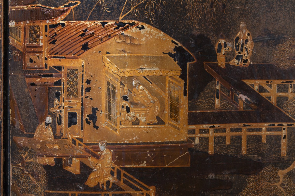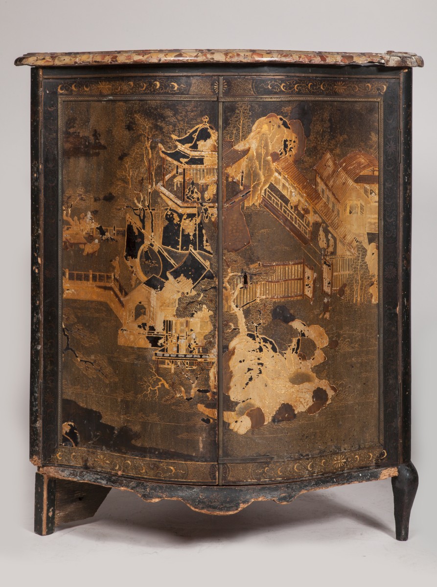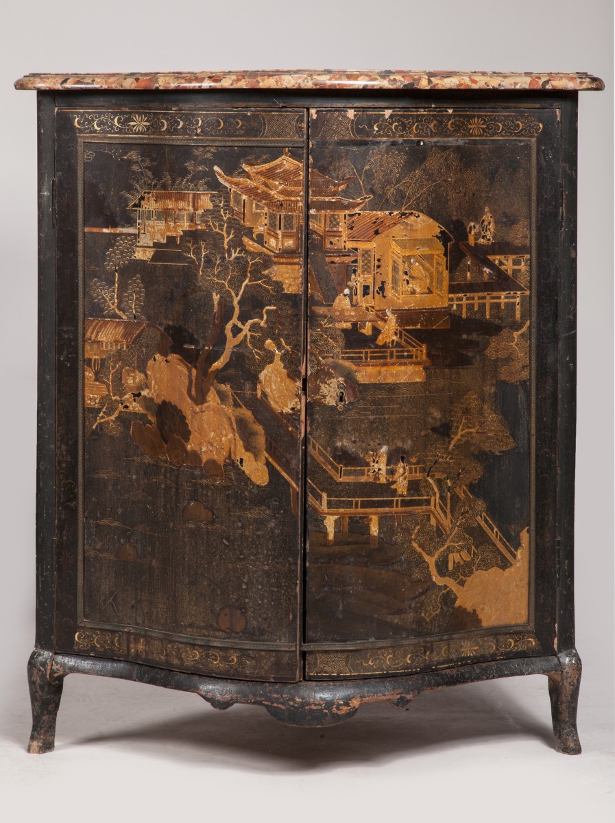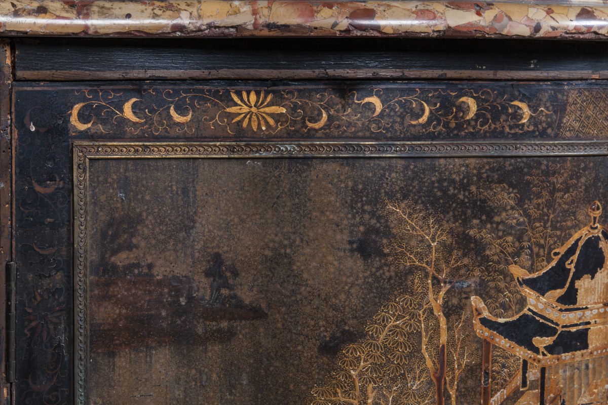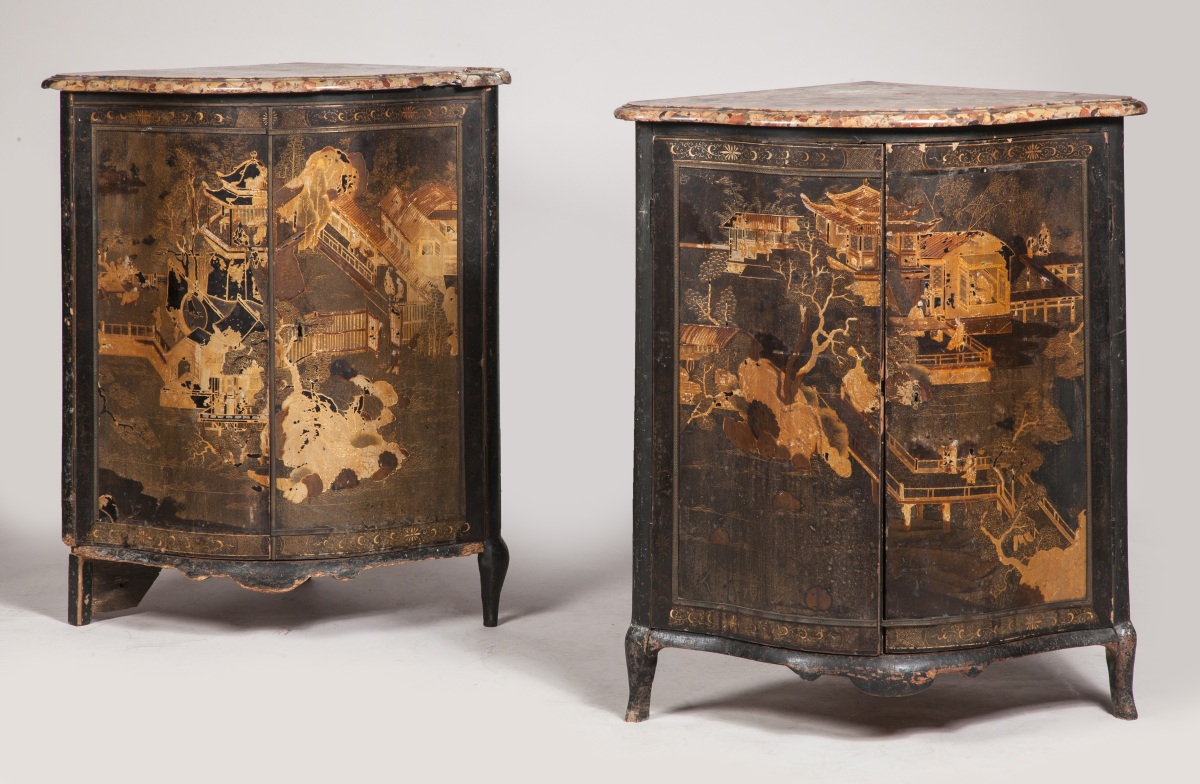 PAIRE d'ENCOIGNURES en laque de la Chine, et vernis européen à fond noir. Décor or de scènes de palais animées de personnages sur l'extérieur des vantaux. L'intérieur en placage de palissandre et marqueterie d'une étoile à huit branches pour les portes . Dessus de marbre brèche à double bec de corbin.