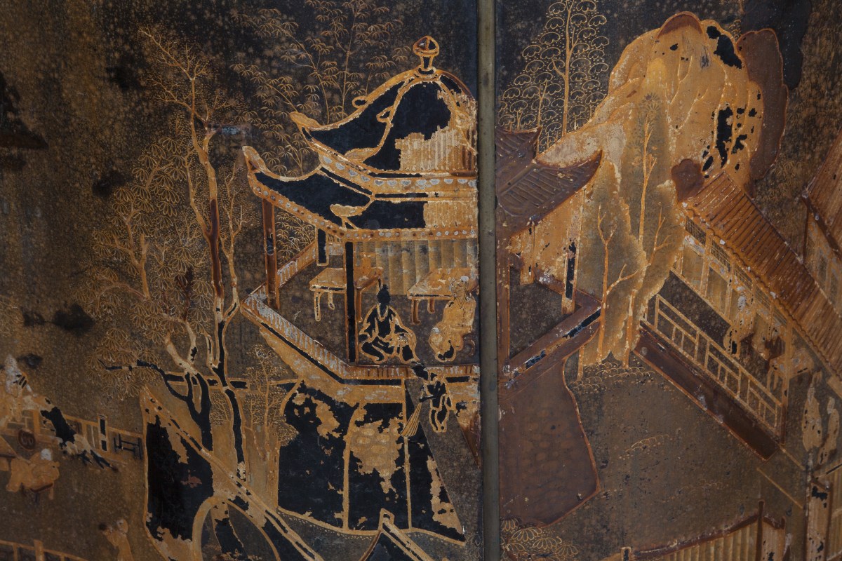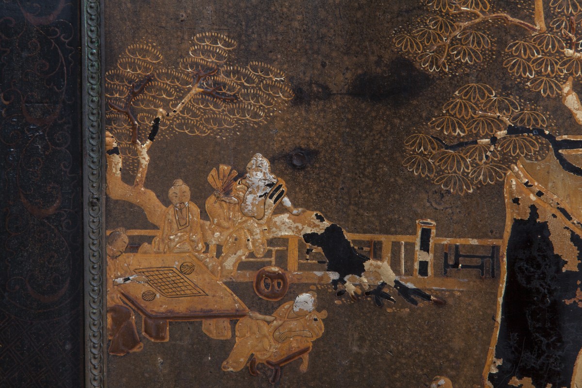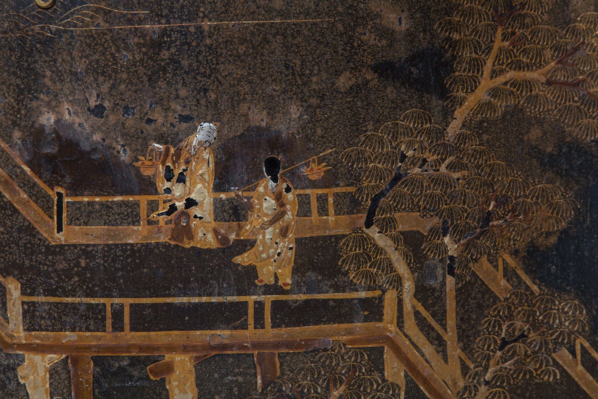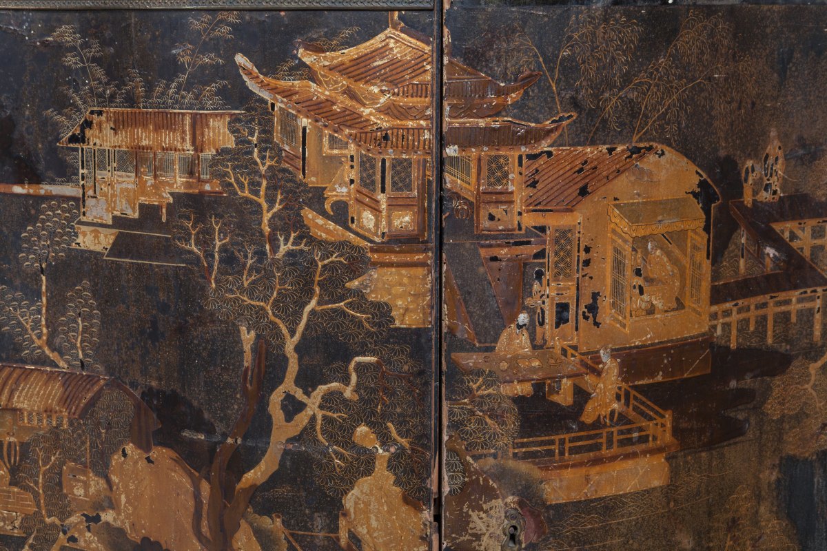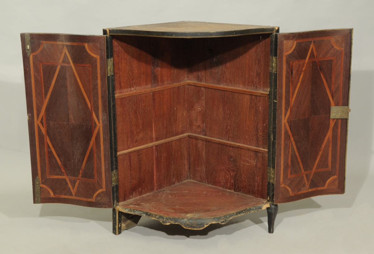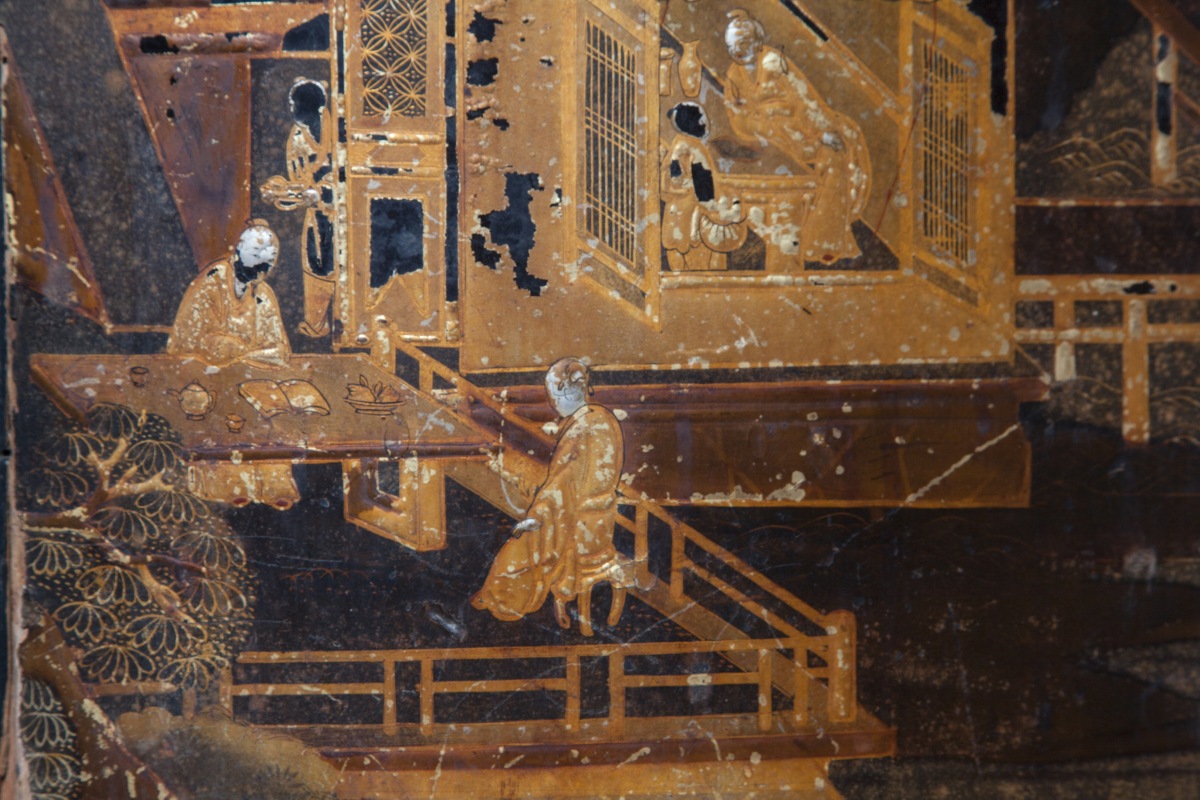 PAIRE d'ENCOIGNURES en laque de la Chine, et vernis européen à fond noir. Décor or de scènes de palais animées de personnages sur l'extérieur des vantaux. L'intérieur en placage de palissandre et marqueterie d'une étoile à huit branches pour les portes . Dessus de marbre brèche à double bec de corbin.