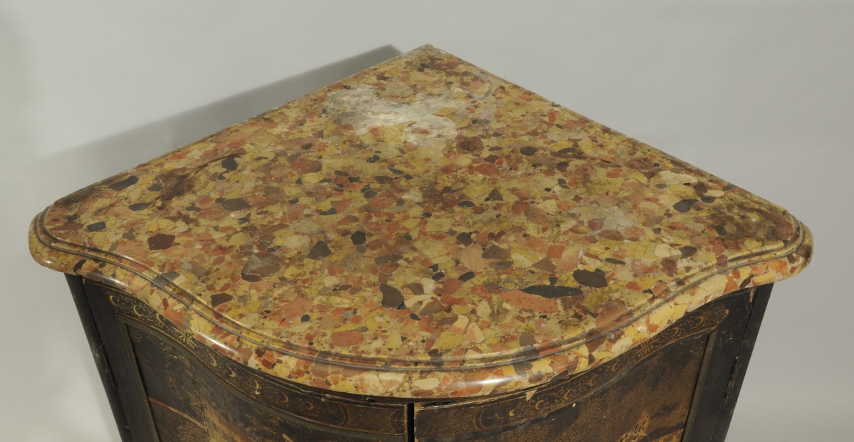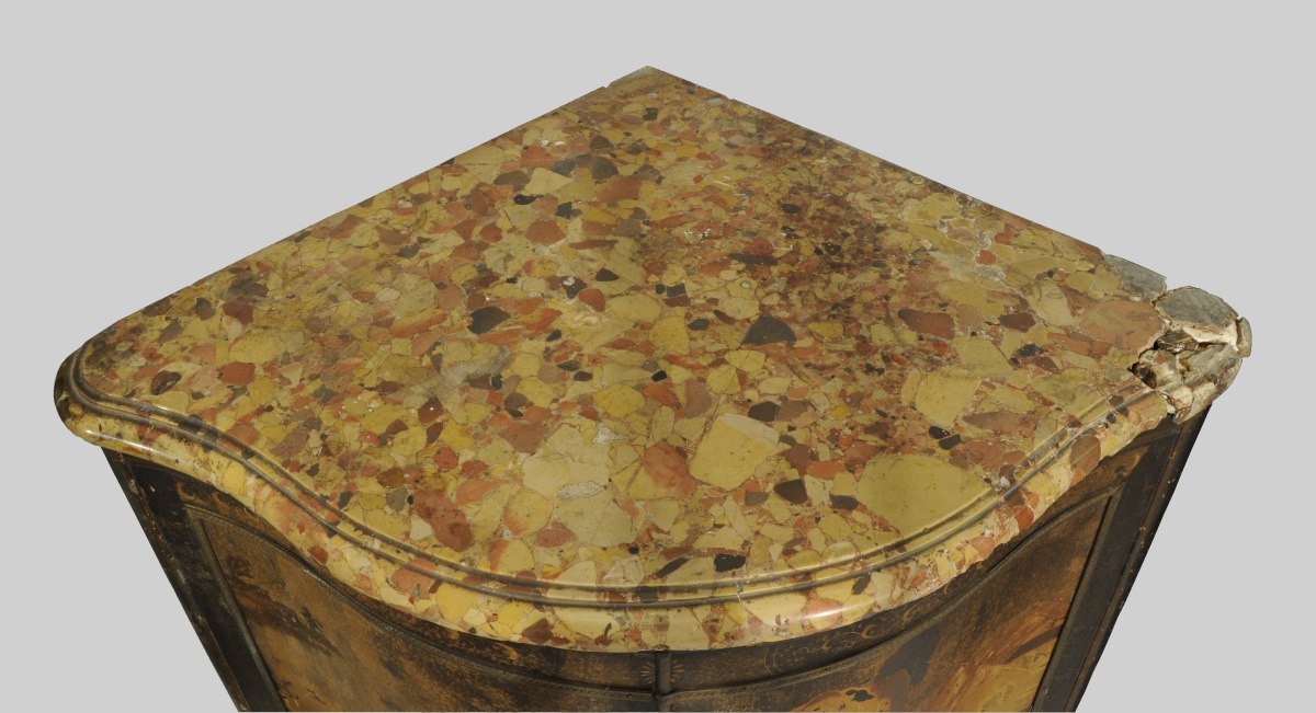 Mentionnée dans l'inventaire des collections de Pierre Jean François de La Porte, conseiller d'Etat et intendant du Bourbonnais puis du Dauphiné, et de son épouse née Le Fèvre de Caumartin, au château de Meslay en Vendômois en 1785: "Dans le salon. (...) Deux encoignures et leurs dessus de marbre."