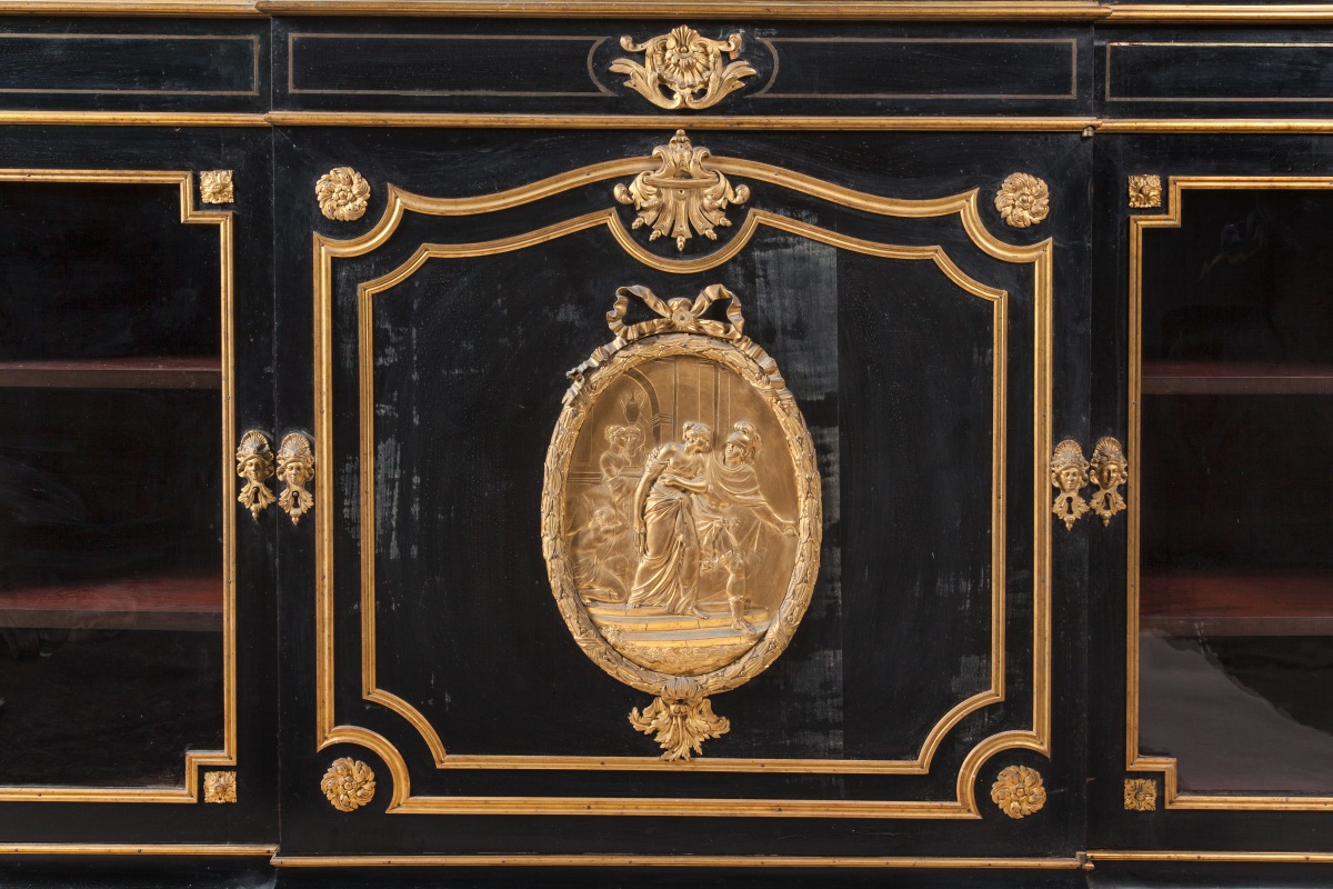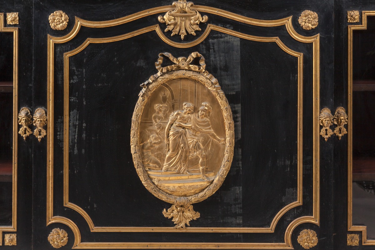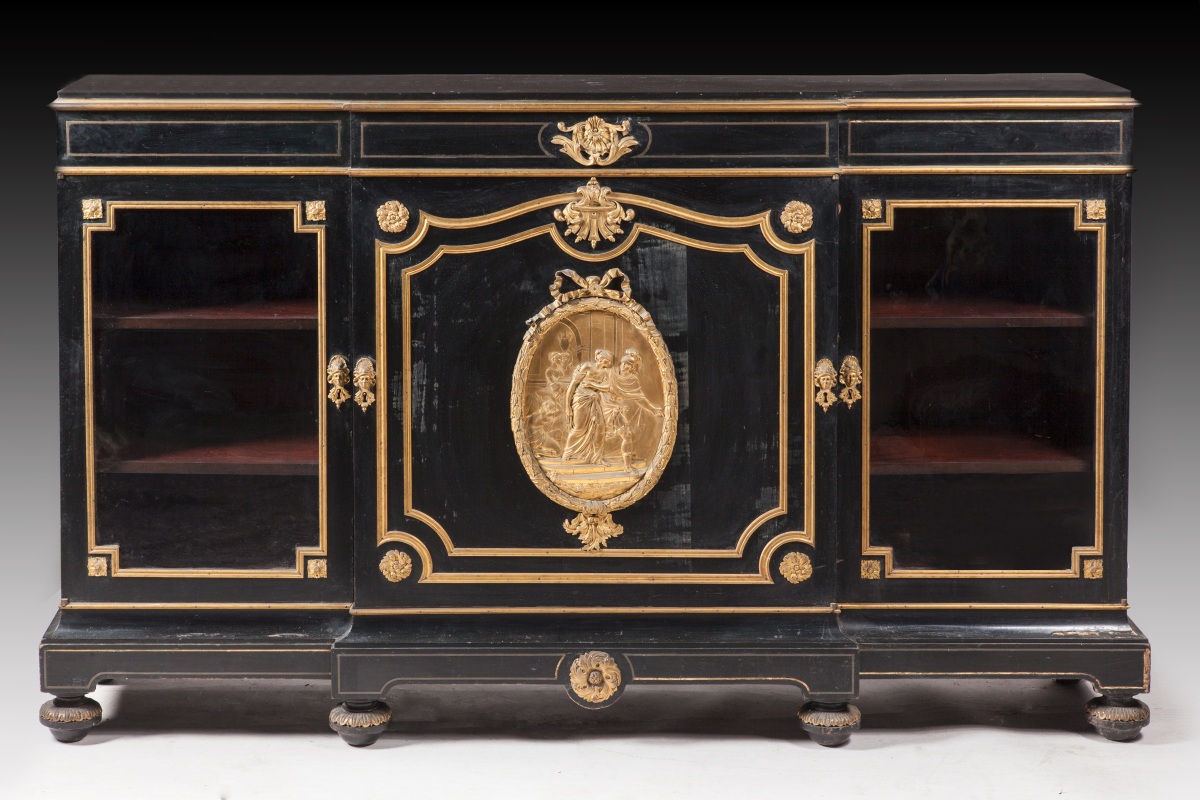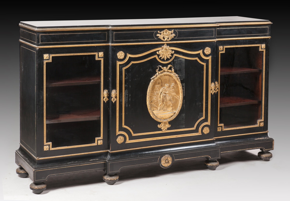 BAS d'ARMOIRE en bois noirci à filets de cuivre. Il ouvre à trois portes dont deux latérales vitrées. La porte centrale à ressaut est ornée d'un médaillon en bronze doré figurant une scène mythologique