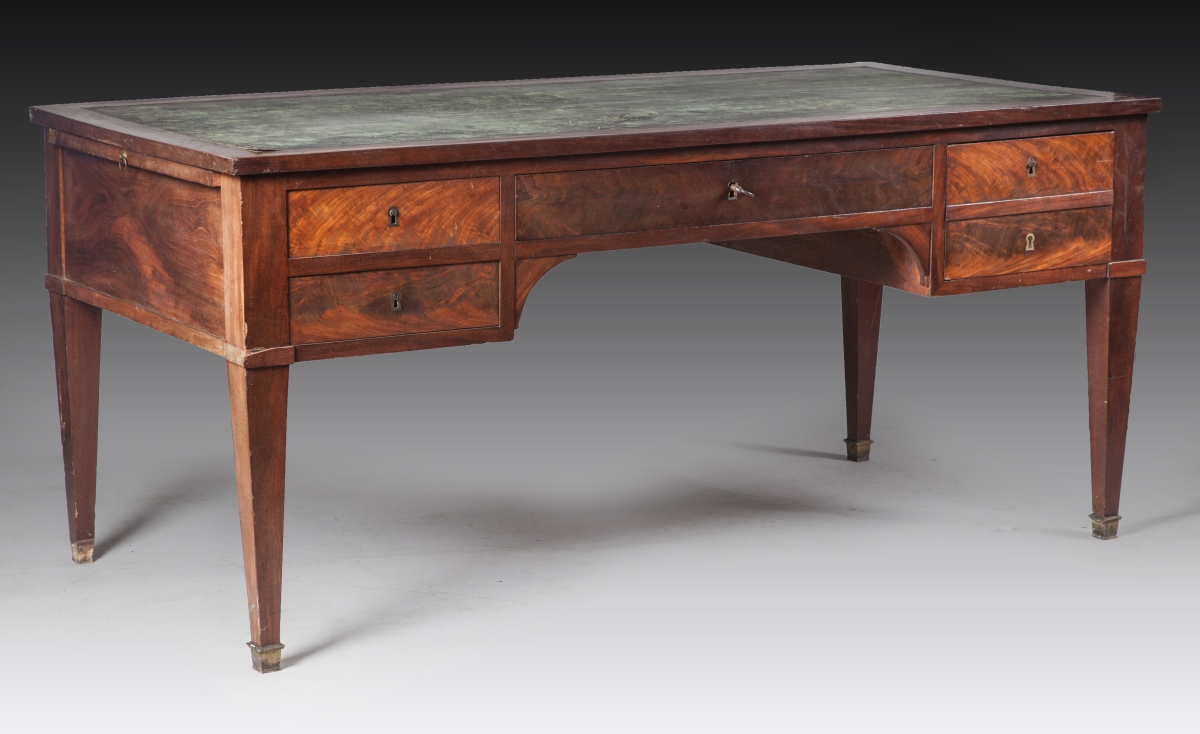 BUREAU À CAISSONS dit " de MINISTRE " en acajou et placage d'acajou. Plateau de forme rectangulaire foncé d'un cuir vert doré aux petits fers. Il ouvre en façade par quatre tiroirs dont un découvrant un casier compartimenté et un coffre. Sur les côtés, deux tirettes foncées de cuir vert doré aux petits fers. Il repose sur quatre pieds en gaine terminés par des sabots de bronze doré.