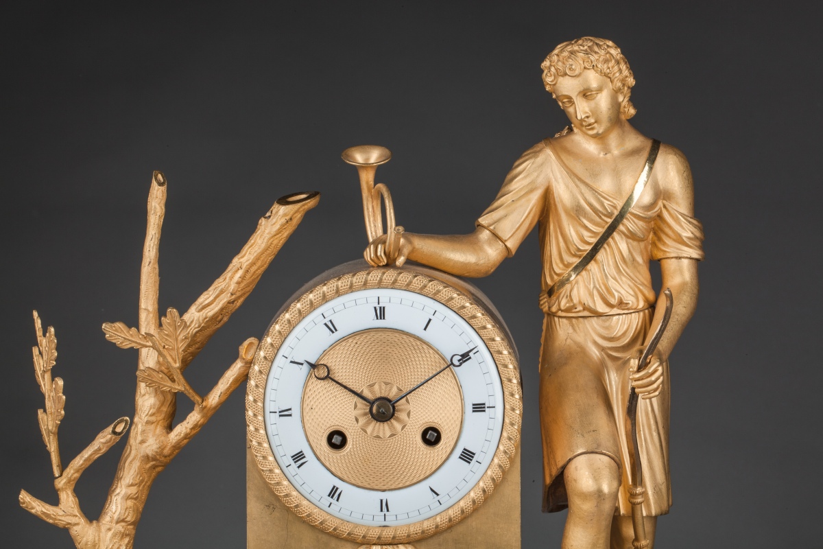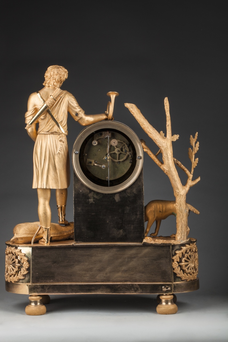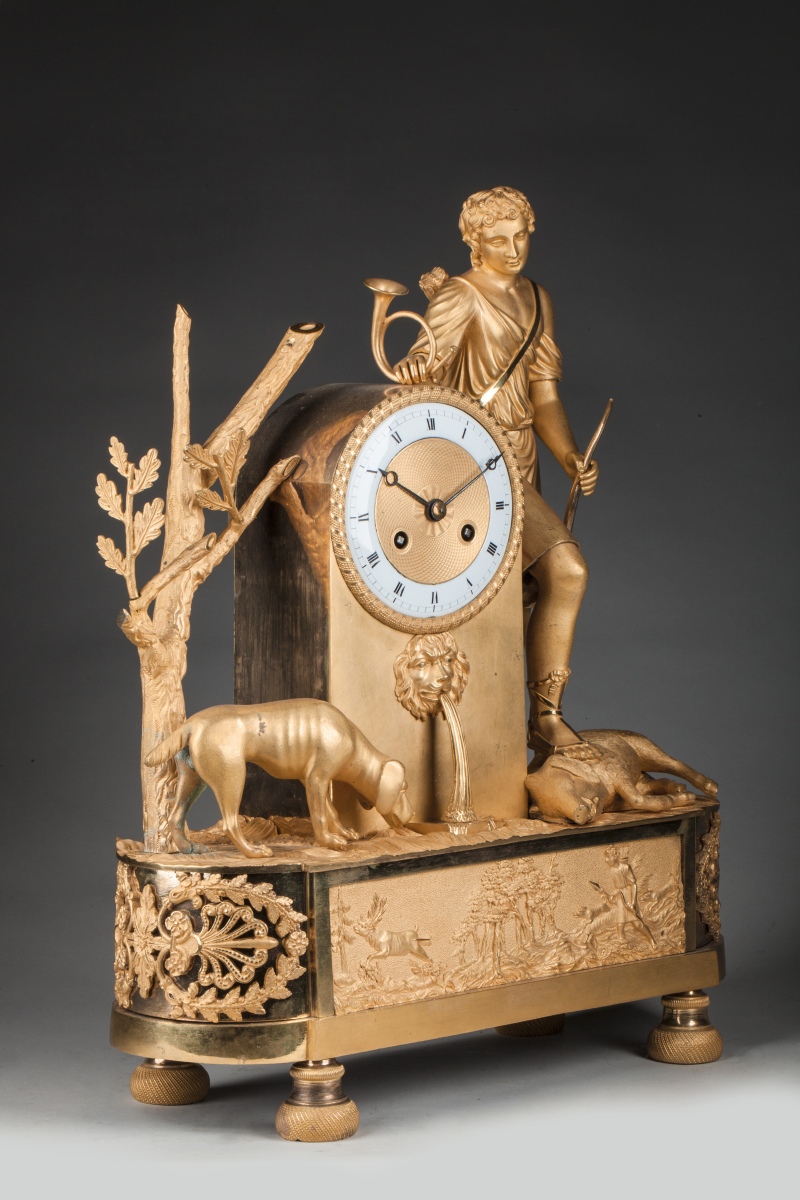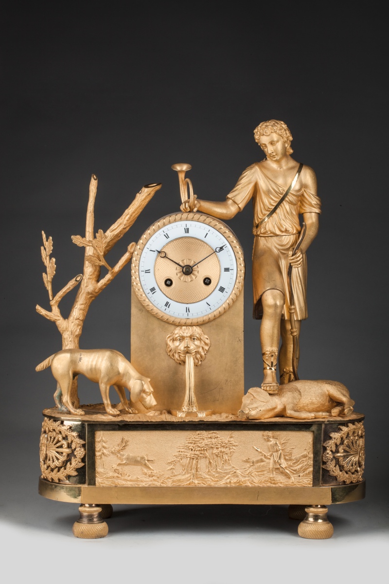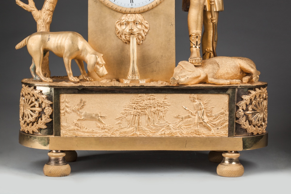 PENDULE en bronze ciselé et doré figurant Actéon, le pied droit appuyé sur la dépouille d'un sanglier. Il tient d'une main son arc et de l'autre une trompe, s'appuye sur une borne accueillant le cadran. Au-dessous, un masque léonin crache de l'eau. Son chien s'abreuve près d'un arbre. La base accueille, sur un léger ressaut, une frise en basrelief figurant une chasse au cerf. Les extrémités sont agrémentées de palmettes et branches de chêne. L'ensemble repose sur quatre pieds en boule à motif de rais de perles torses. Le cadran se compose d'un anneau émaillé blanc indiquant les heures en chiffres romains, gradué pour les minutes, et d'un disque guilloché en partie centrale.