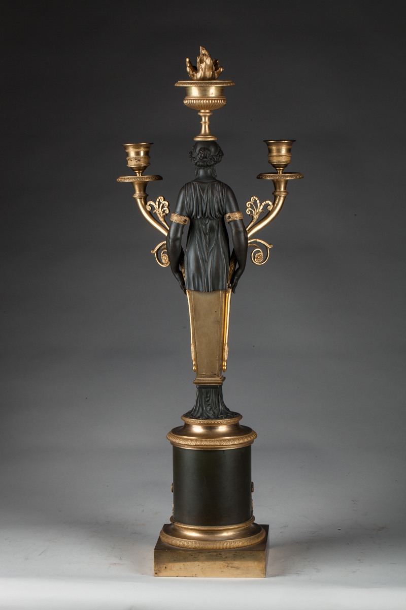 PAIRE DE CANDÉLABRES à trois lumières en bronze doré et bronze patiné figurant une cariatide gainée vêtue à l'antique. Elle tient dans chaque main une torche ornée de rinceaux et enroulements soutenant un binet. Un pot à feu formant le troisième binet repose sur sa tête. La base rectangulaire