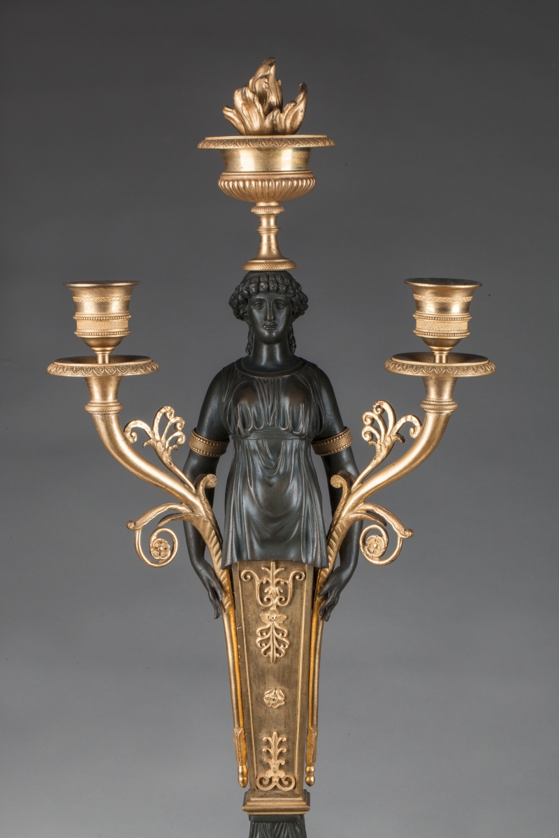 L'association du bronze doré et du bronze patiné et la finesse de la ciselure sont les marques d'un bronzier talentueux. Cette paire de candélabres n'est pas sans rappeler de nombreux modèles