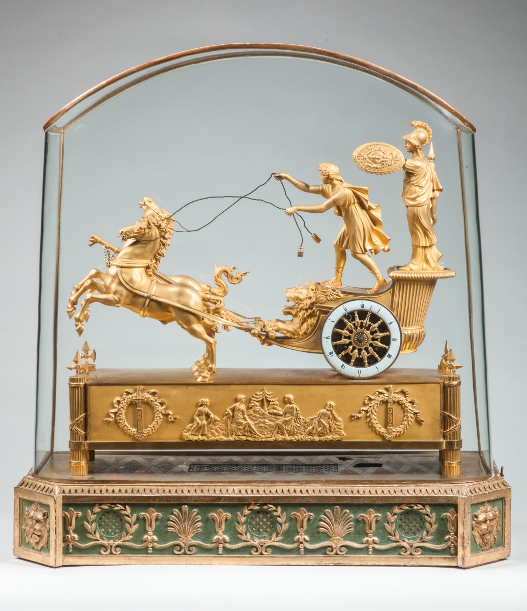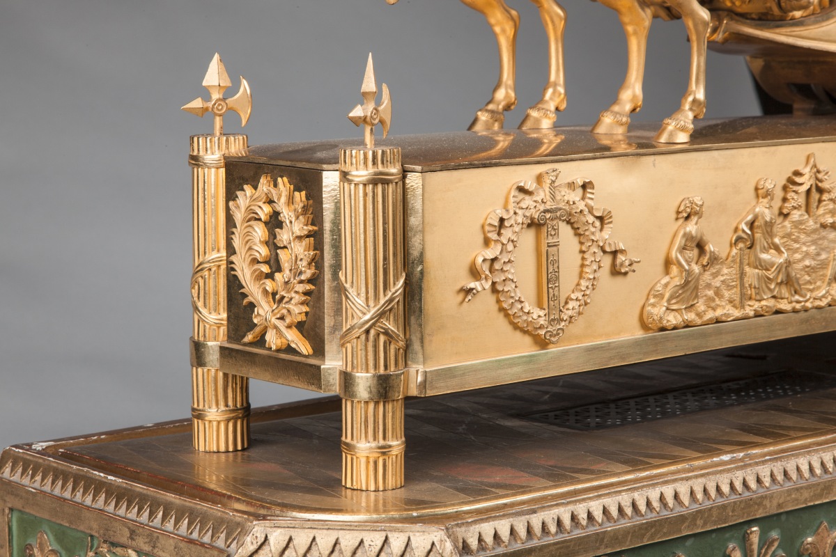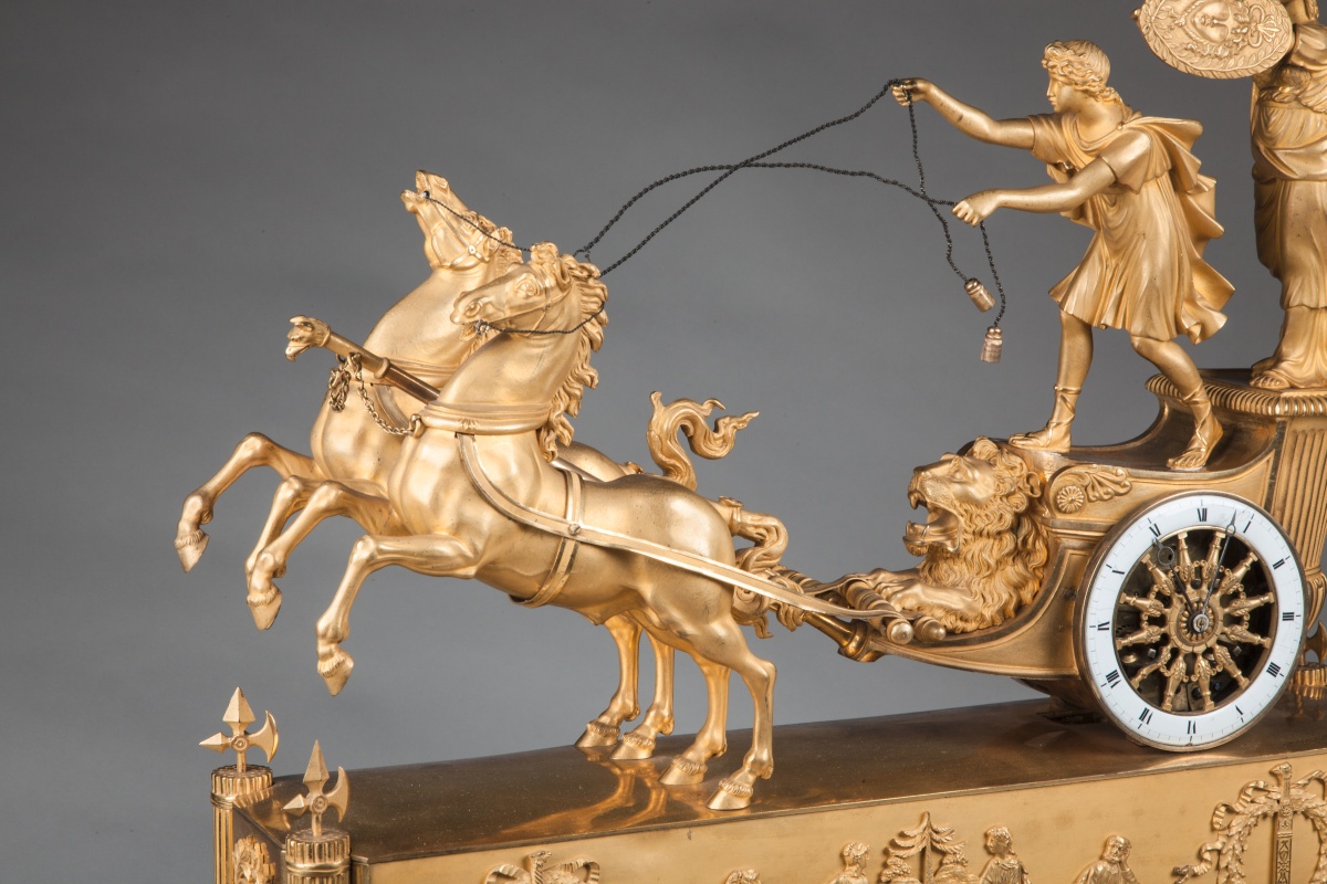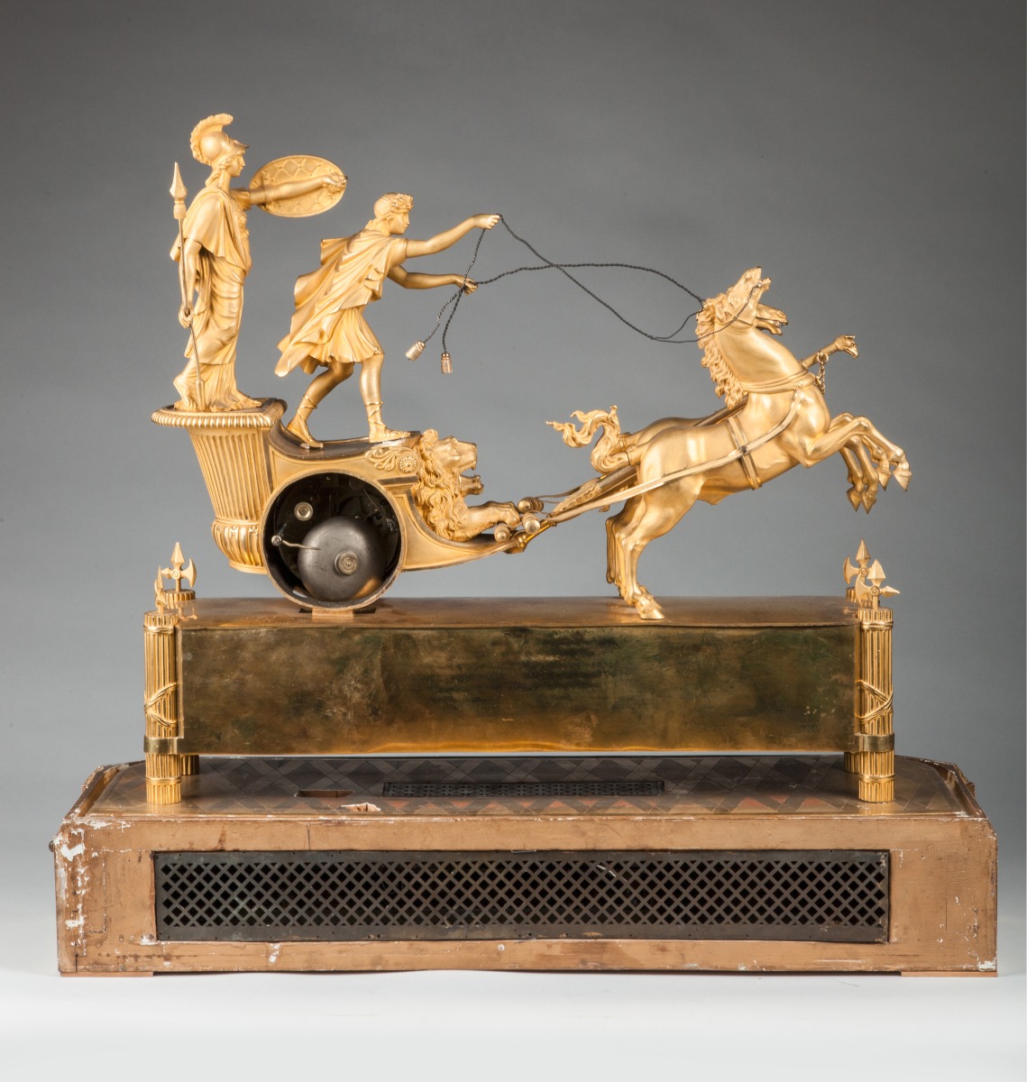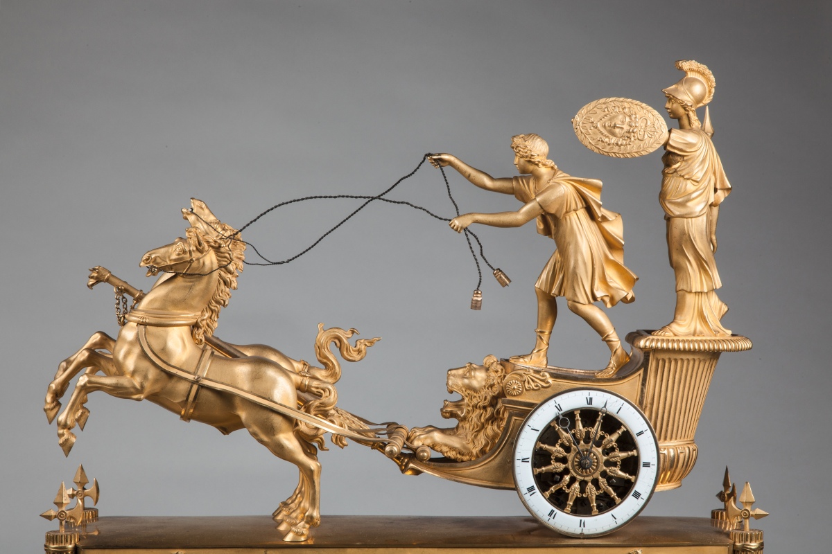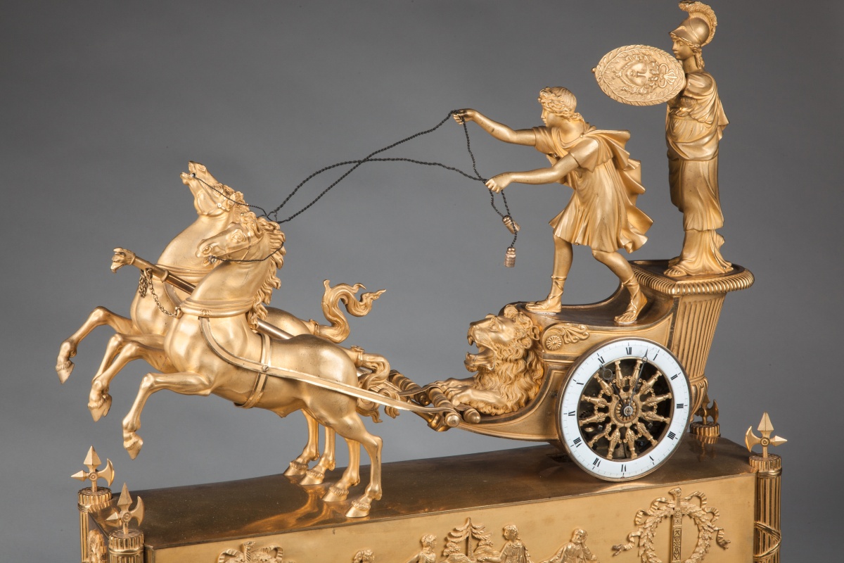 PENDULE MUSICALE dite " AU CHAR " en bronze doré représentant Télémaque conduisant son char - les chevaux se cabrant - sous la protection d'Athéna. Base ornée d'une frise de personnages figurant les amours de Télémaque, de couronnes de laurier et de glaives, portés par quatre faisceaux de licteur. Le cadran en émail blanc.
