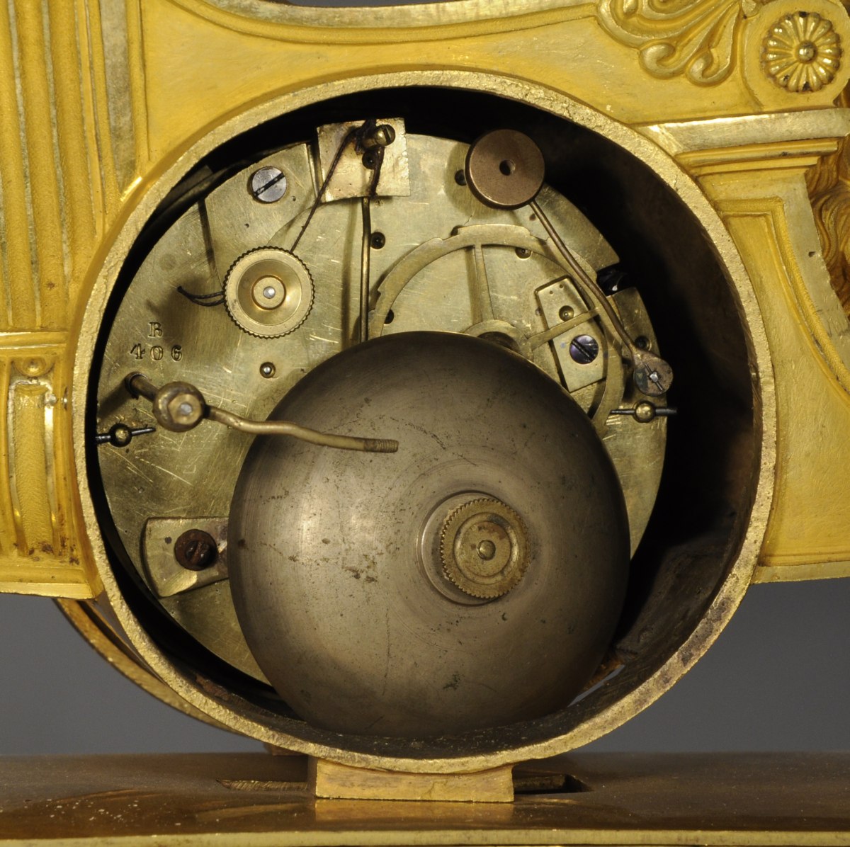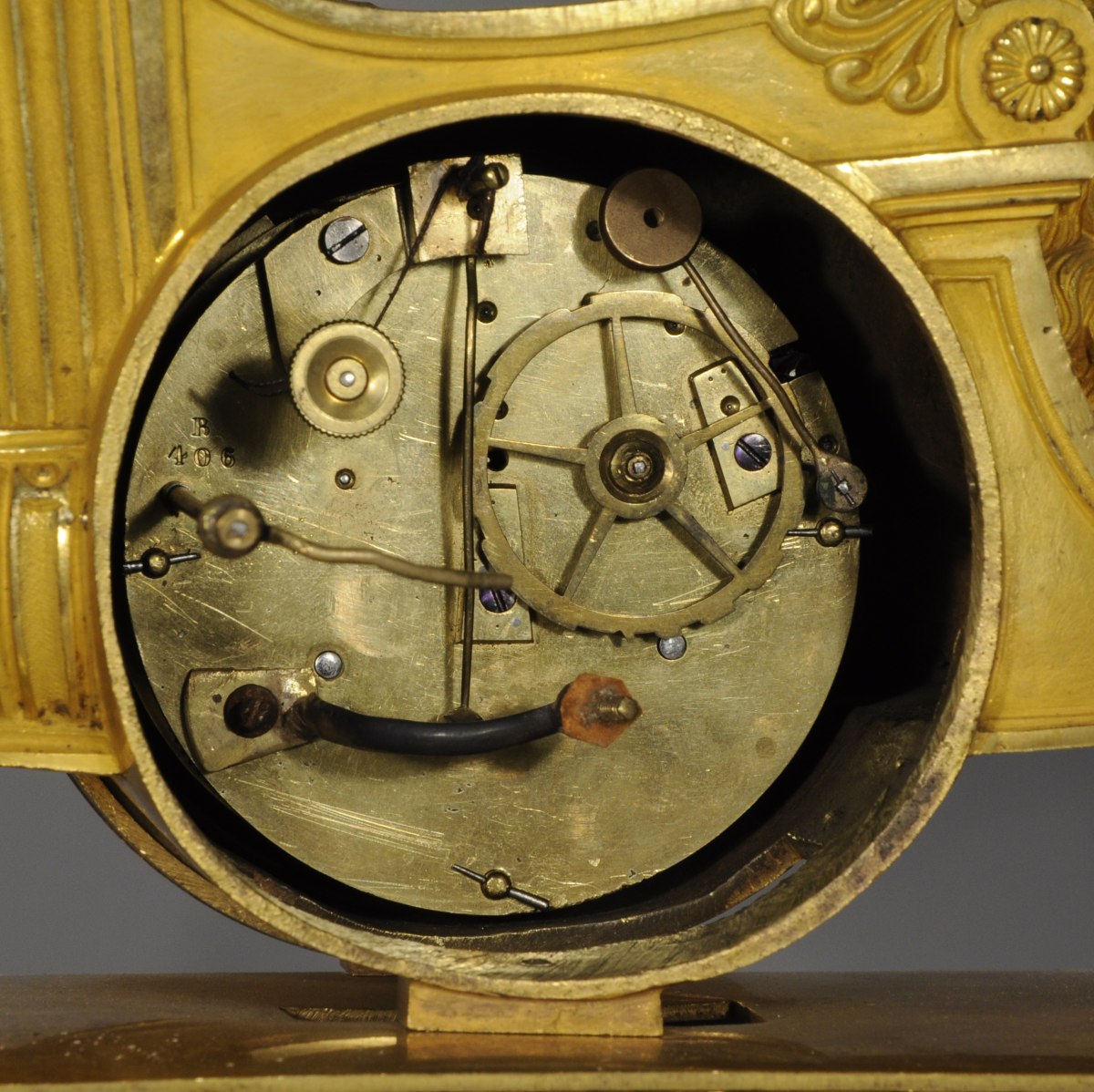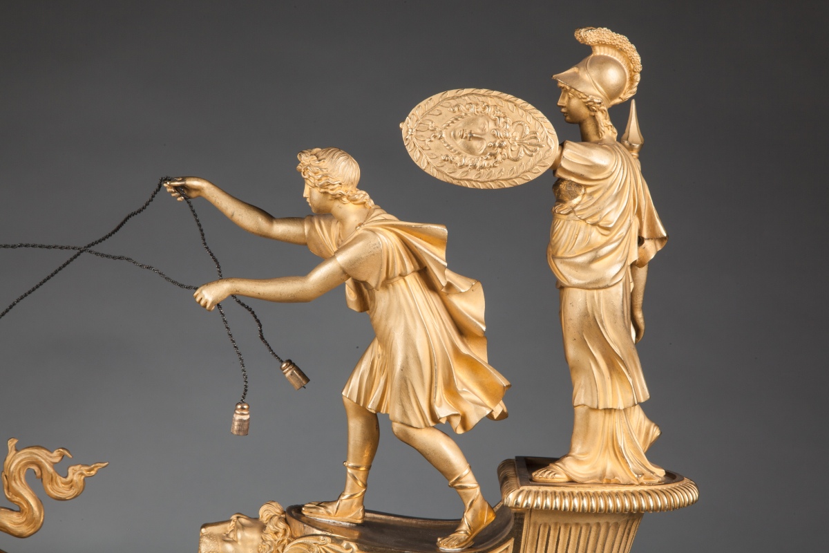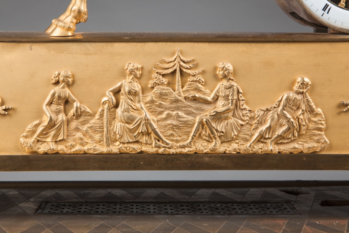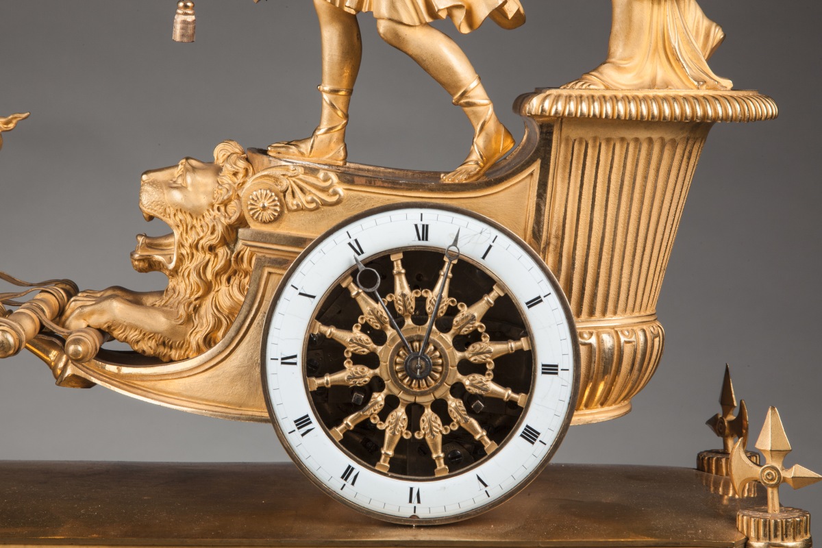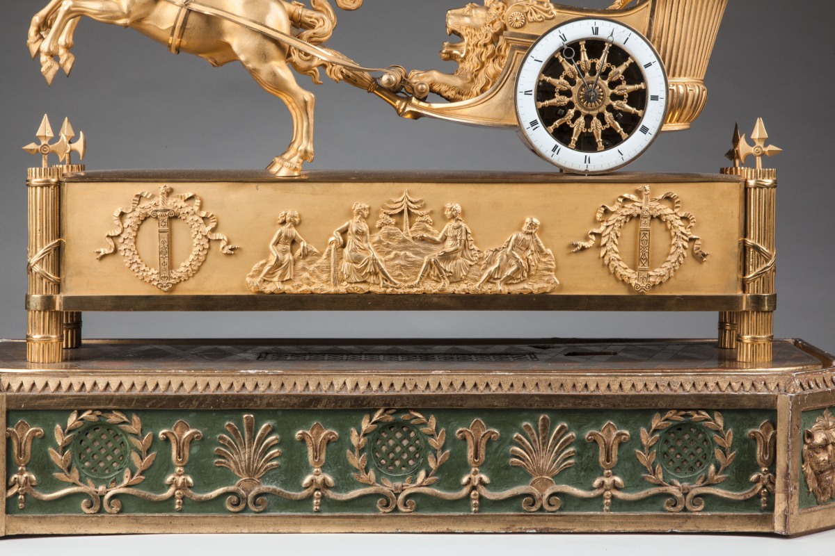 PENDULE MUSICALE dite " AU CHAR " en bronze doré représentant Télémaque conduisant son char - les chevaux se cabrant - sous la protection d'Athéna. Base ornée d'une frise de personnages figurant les amours de Télémaque, de couronnes de laurier et de glaives, portés par quatre faisceaux de licteur. Le cadran en émail blanc.