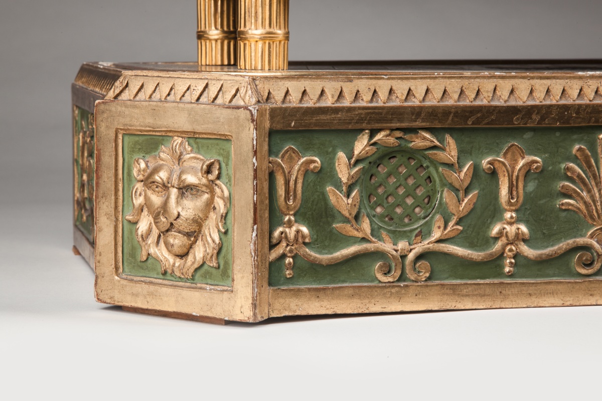 SOCLE quadrangulaire à pans coupés en bois verni vert et doré figurant mufle de lion et palmes, contenant une BOÎTE À MUSIQUE de 12 airs (?), sonnant alternativement à chaque heure. Sous un GLOBE en verre.