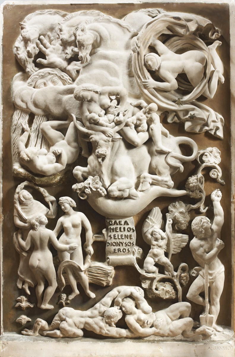 Lorsque Janniot reçoit la commande de la décoration de la façade du Palais de Tokyo, en 1937, il choisit d'illustrer une "Allégorie à la Gloire des Arts" en haut-relief. Les parties gauche et droite de la façade sont respectivement consacrées au monde chthonien (Centaure et chevaux) et au monde aquatique (Triton et Néréide). Les divinités présentes sur ce hautrelief correspondent à celles de la partie gauche de la façade, consacrée à la " Légende de la Terre ". Elles sont, ici, organisées autour du groupe central figurant la Terre Nourricière allaitant un enfant. Le plâtre patiné de cette composition est conservé dans une collection particulière (Giraud, 2006, p. 122). À la Thébaïde, Janniot choisit de placer ce relief de pierre en guise de trumeau de cheminée, exactement comme il l'a fait avec l'architecte Roux Spitz pour le salon des frères Orban à Bruxelles (1938).