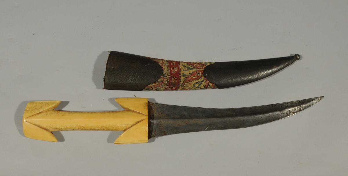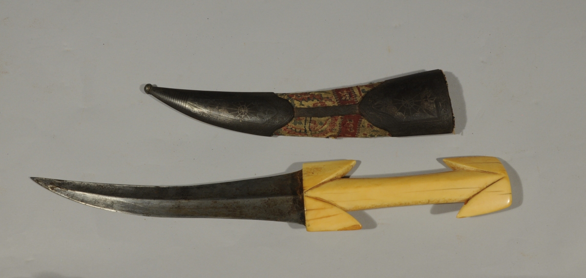 POIGNARD KHANDJAR OTTOMAN. Poignée en ivoire. Lame courbe à arête médiane. Fourreau en bois recouvert d'un tissage, à deux garnitures en fer niellé.
