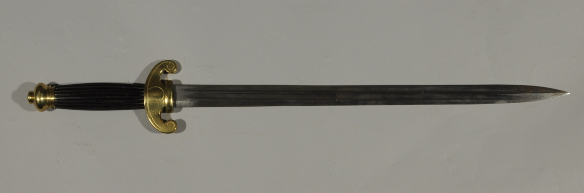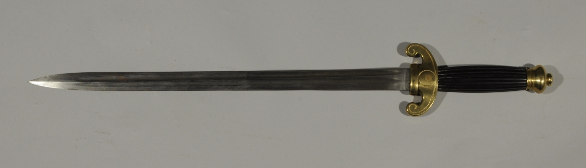 Poignée en corne. Monture en laiton gravé, garde à deux quillons recourbés. Lame droite à double gouttière.