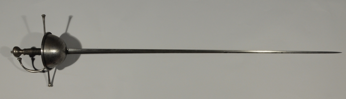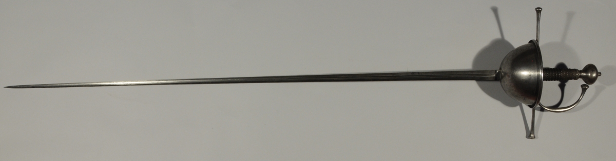 Poignée filigranée de fer. Monture en fer, garde à une branche, pas d'âne, deux longs quillons droits et coquille Longue lame à gouttière centrale.
