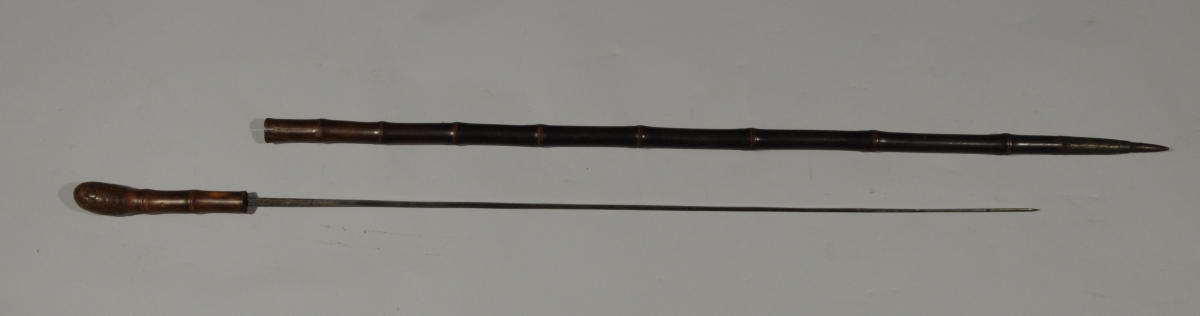 CANNE-ÉPÉE en bambou. La lame quadrangulaire gravée "Olingen". Pommeau en bois noueux. Bouterolle en laiton terminée par une pointe. Long. 94,5 cm. (fentes)