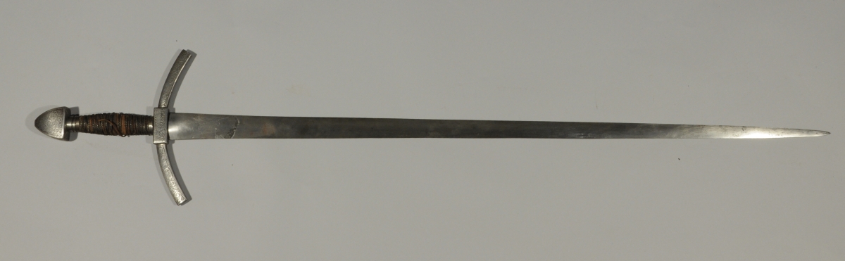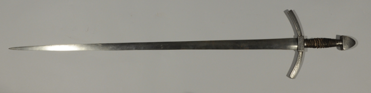 Poignée en bois recouvert de filigrane (accidents). Pommeau, nud de corps et quillons décorés de rinceaux feuillagés. Lame à deux tranchants.