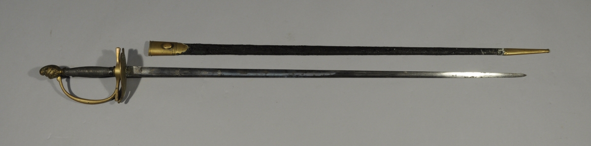 ÉPÉE D'UNIFORME, premier modèle. Plateau en lyre asymétrique avec cannelures sur le pourtour et quillon en palmette. Quillons droits quadrangulaires, fusée filigranée de métal et pommeau au casque empanaché du modèle d'officier d'état-major Vendémiaire, lame à dos plat ciselée au tiers de feuillages stylisés et trophées d'armes. Fourreau en cuir à deux garnitures en laiton. Pontet olive. Premier Empire.