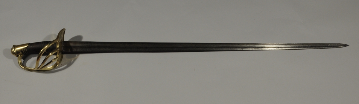 Poignée en bois recouvert de basane (accident, manque le filigrane). Monture en laiton, garde à quatre branches. Lame droite à double pans creux, pointe au centre (piqûres).