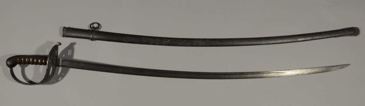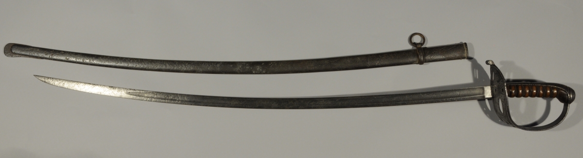 Poignée en bois verni. Monture en fer gravé et ajouré. Lame cintrée à pans creux. Fourreau en tôle de fer à un bracelet.