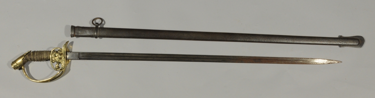 Poignée en basane avec filigrane (manque). Monture en laiton, garde à une branche et coquille rabattable ciselée de l'Aigle et du monogramme de Wilhem II. Lame droite à double gouttière. Fourreau en tôle de fer à un bracelet (oxydation).