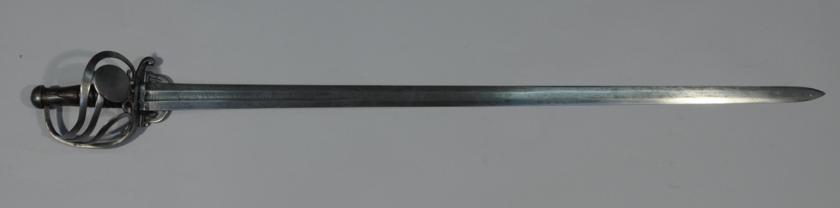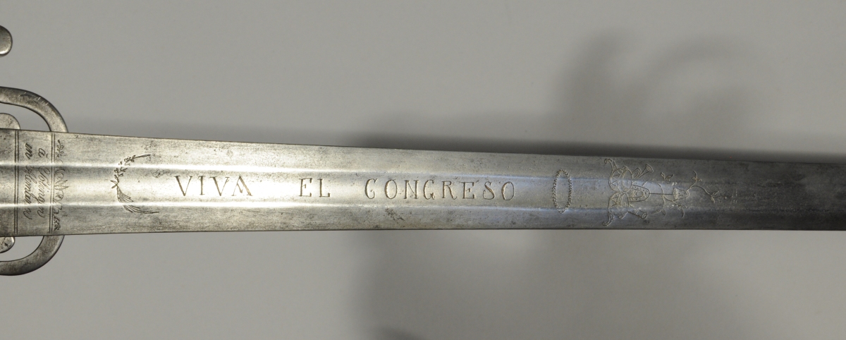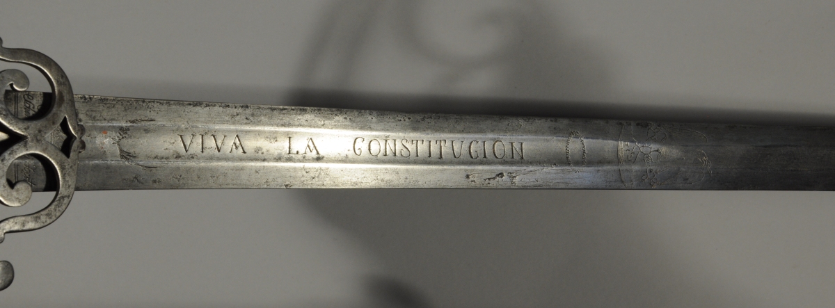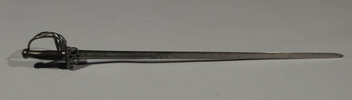 Poignée en bois (manque filigrane). Monture en fer, garde à quatre branches, contre clavier rabattable. Forte lame de " Fabricas de Schinellboesch y Foes à Solingen en Alemana " à méplat médian gravé " Viva el Congreso " et " Viva la Constitucion " et à l'Aigle mexicain.