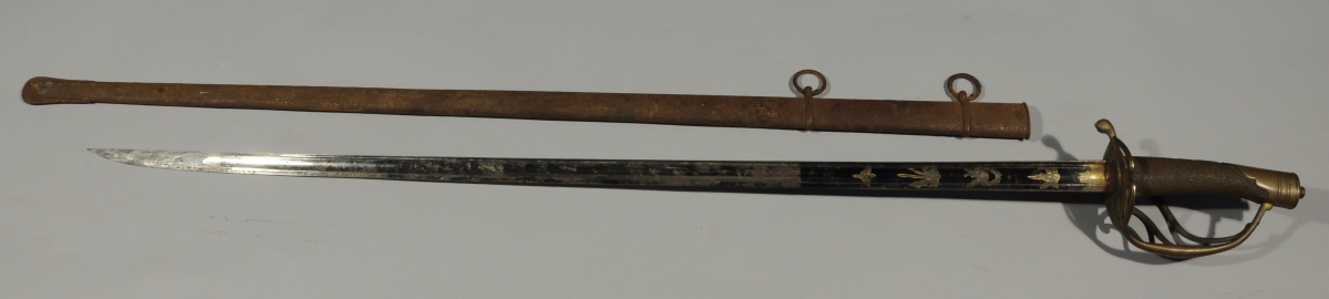 Poignée recouverte de filigrane en laiton. Monture en laiton, calotte à courte jupe, garde à quatre branches. Lame droite à dos plat, pans creux, gravée de trophées d'armes, dorée et bleuie au tiers.