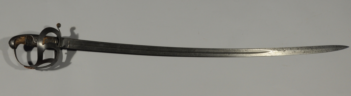 Poignée en bois recouvert de galuchat (accidents, manque). Monture en fer, avec motif rapporté en cuivre " tottemkopf " des hussards. Lame courbe à dos rond et pans creux (piqûres).