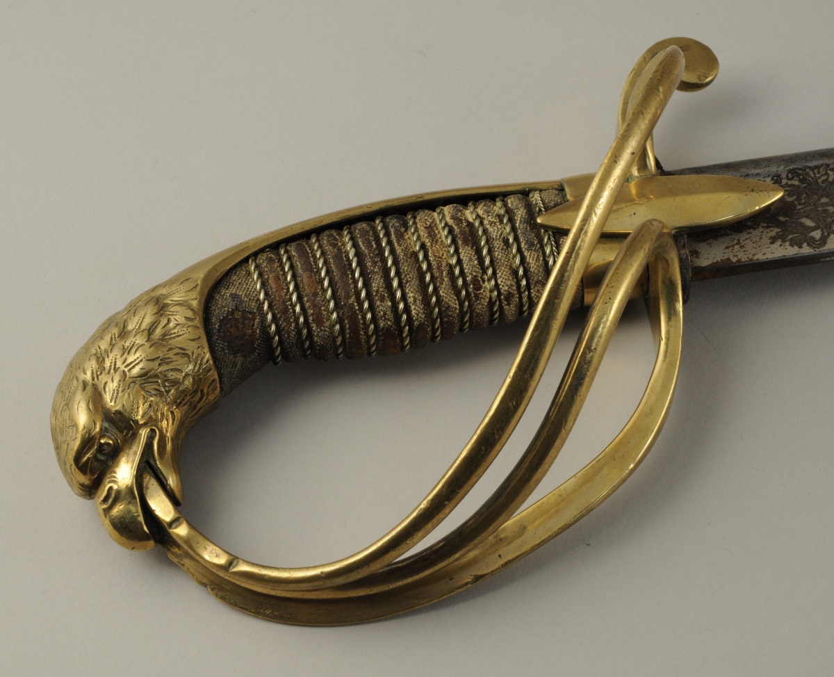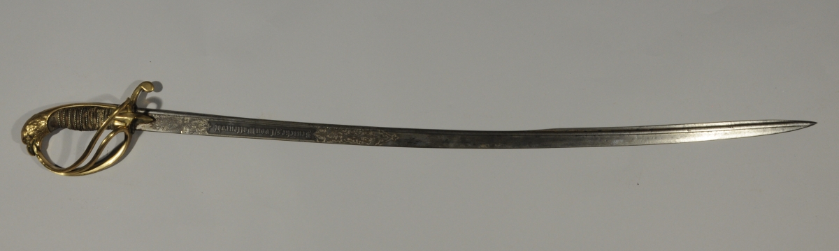 Poignée recouverte de galuchat avec filigrane. Monture en laiton, pommeau ciselé d'une tête d'Aigle, garde à trois branches à deux oreillons en navette. Lame courbe à dos rond, contre tranchant, gravé au tiers de rinceaux feuillagés à cartouche marqué " Benicke s/l von Wallenrodt ".