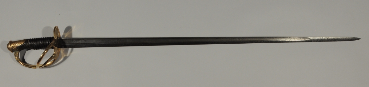 Poignée en corne (manque filigrane). Monture en laiton ciselé de feuillages. Lame droite à dos plat et pans creux avec restes de marquages (piqûres).